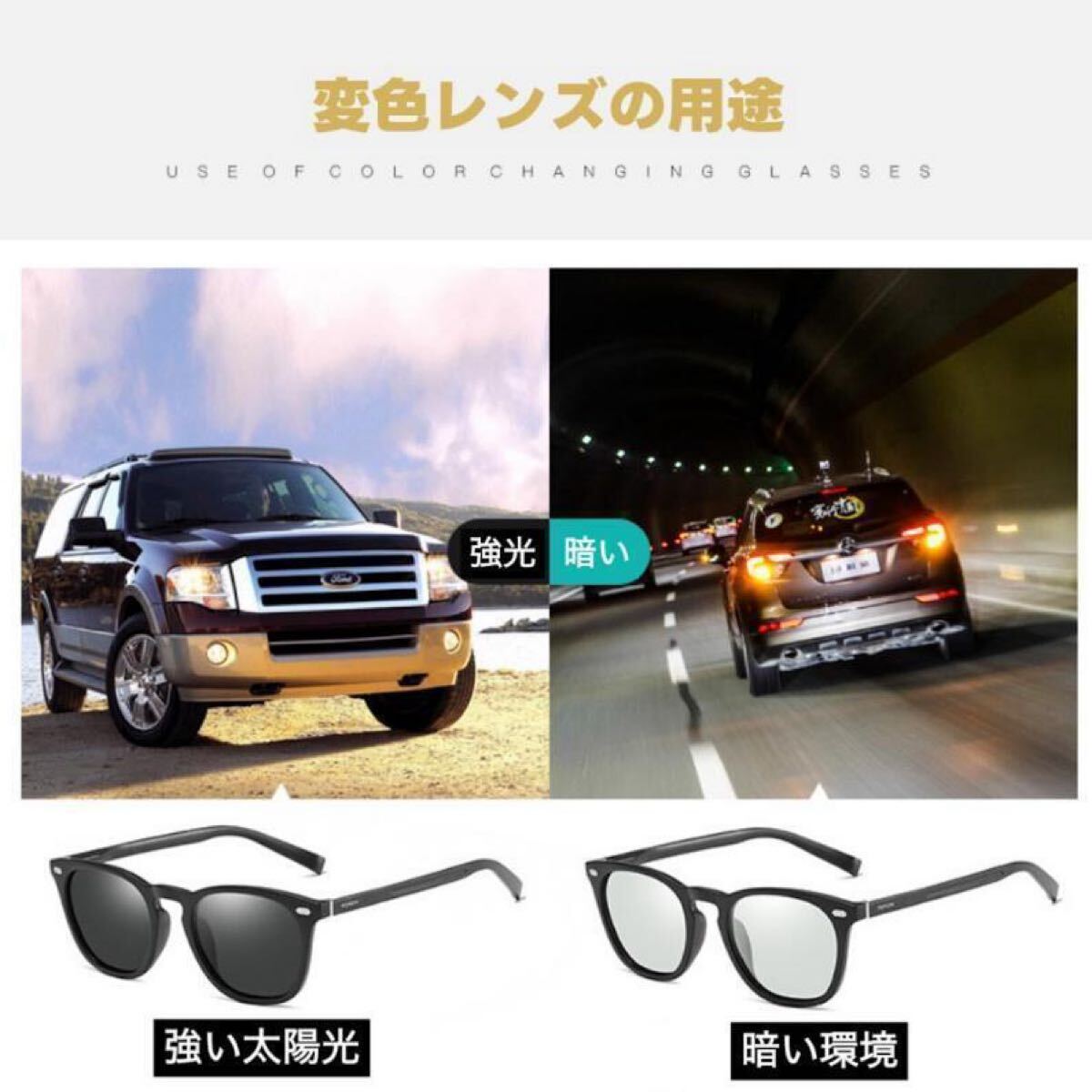 明るい場所ではレンズの色が濃くなり、暗い場所ではレンズの色が薄くなります。