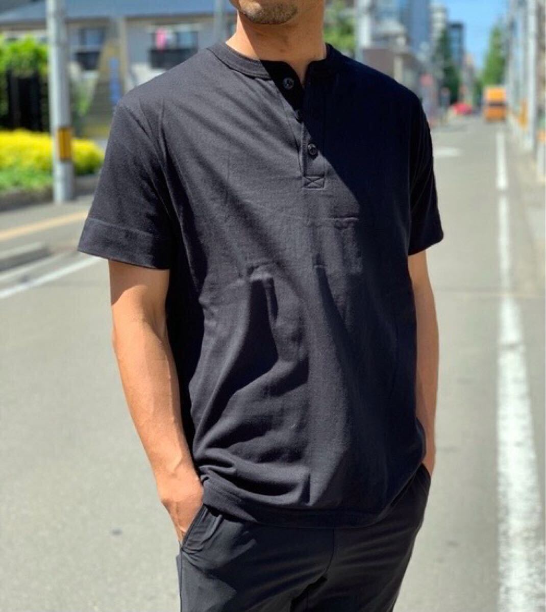 ヘンリーネックの襟元のちょっとした動きでスタイリングのアクセントに。