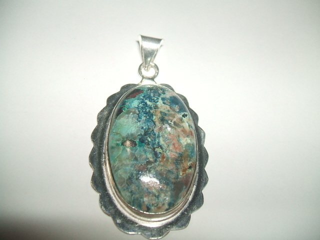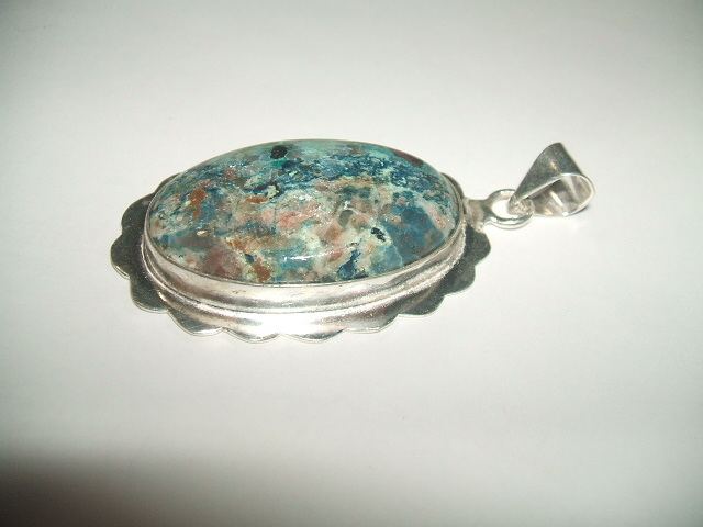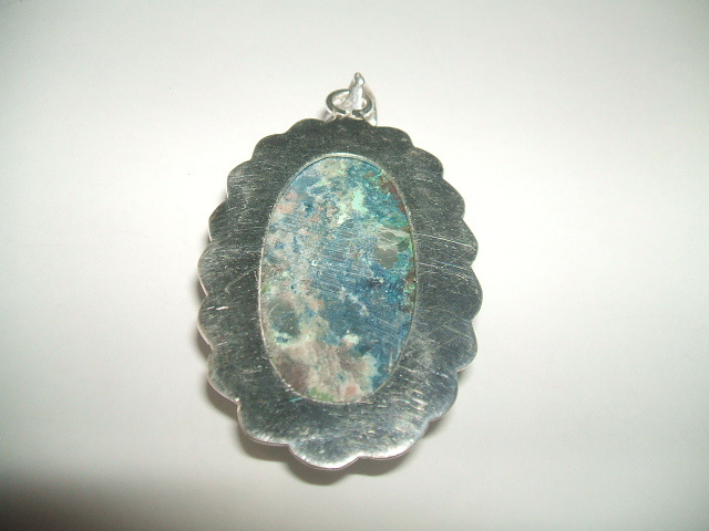 グリーンカラーに黒や茶色、ピンクなど様々な色が混じった模様が印象的なクリソコラトップです。石の大きさは3.5x2.2センチ。周りの金属を入れたトップ全体の大きさは約4.3x3センチ。金属はシルバーですが、925の刻印が見つかりませんので、あらかじめご了承ください。
