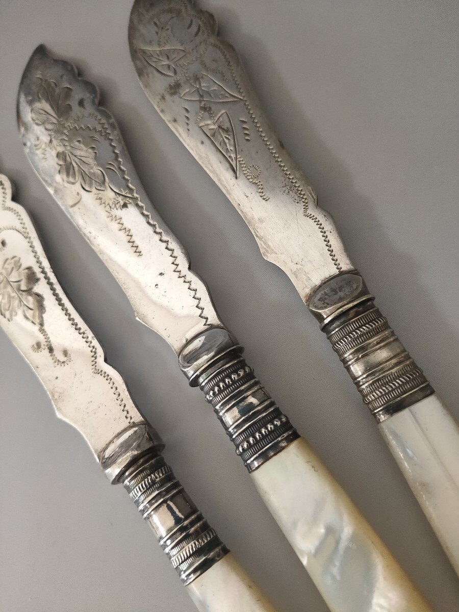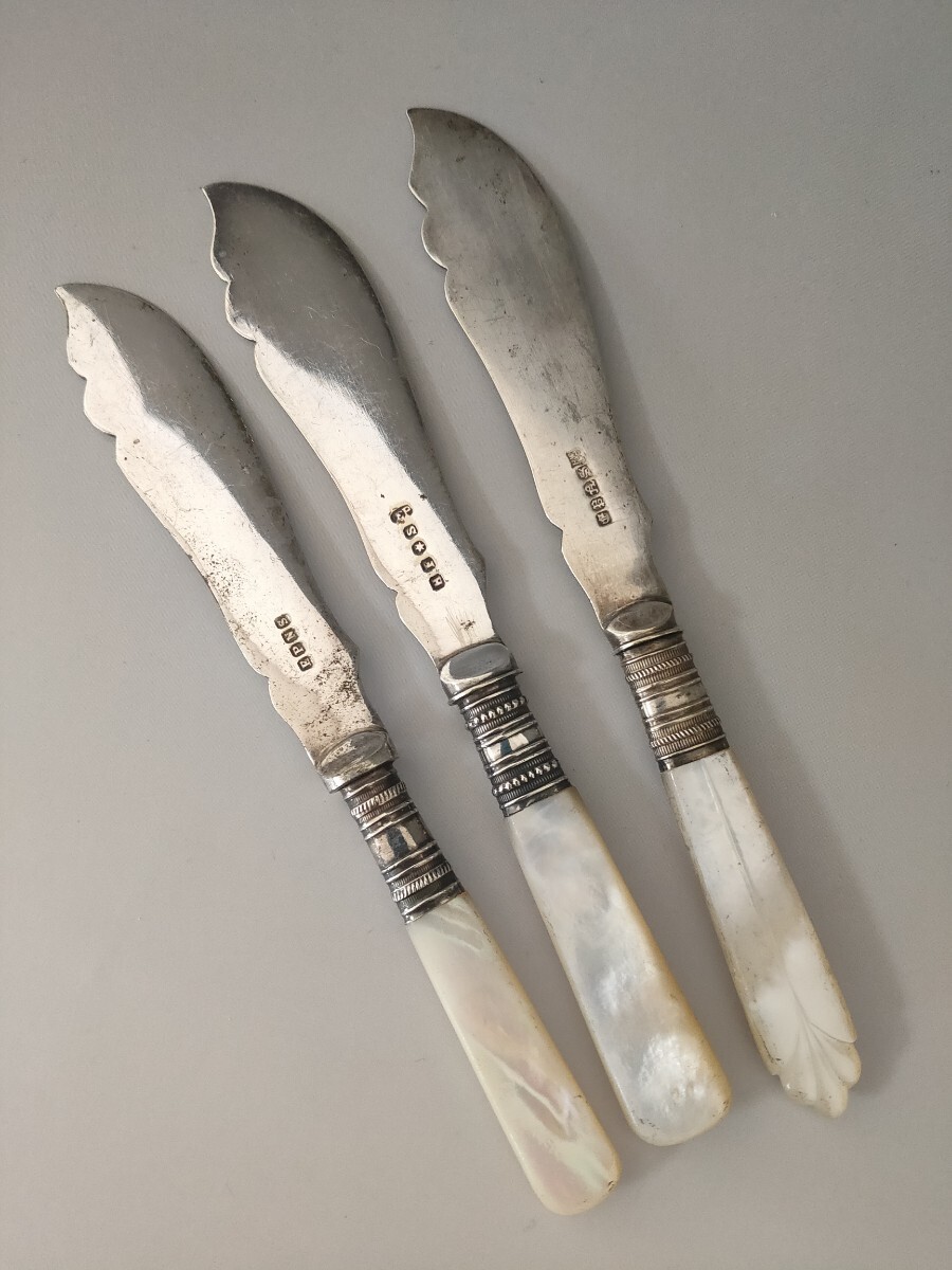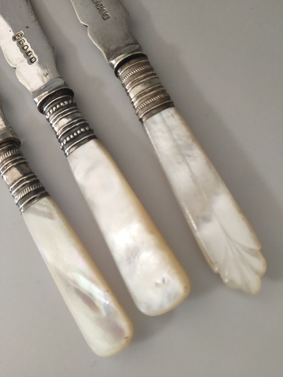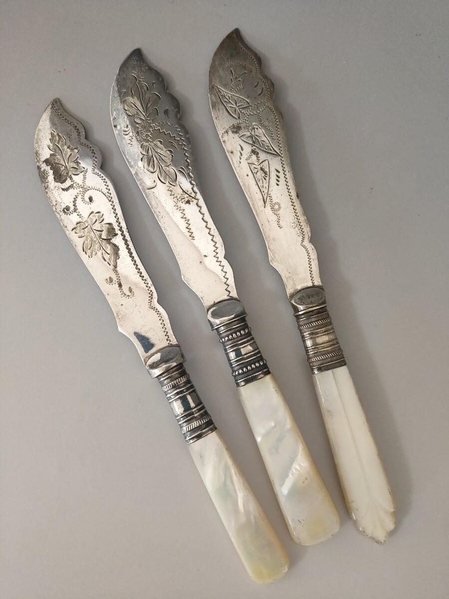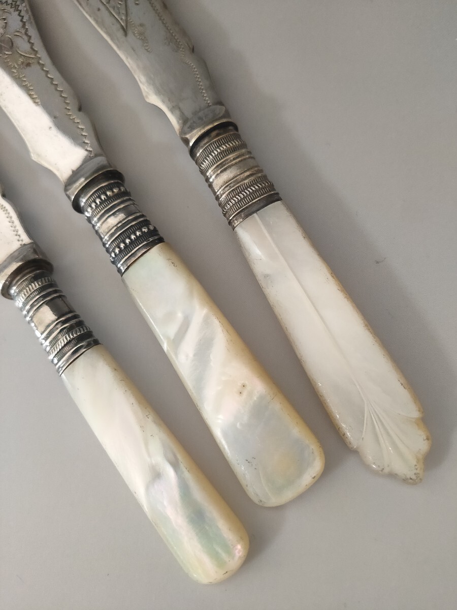 ☆★希少★☆ 英国製アンティーク 白蝶貝ハンドル シルバープレート ナイフ 3本set マザーオブパール MOP ヴィンテージ (L11.①b)