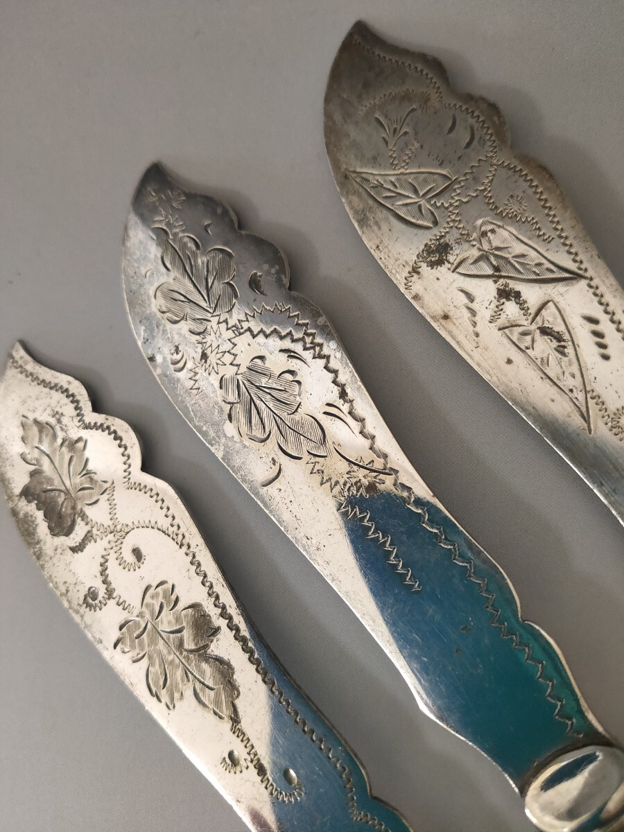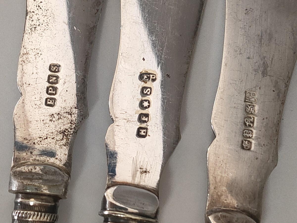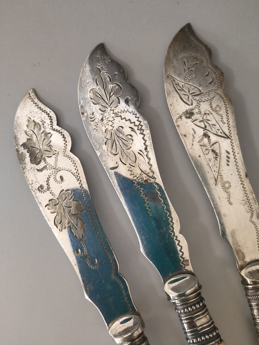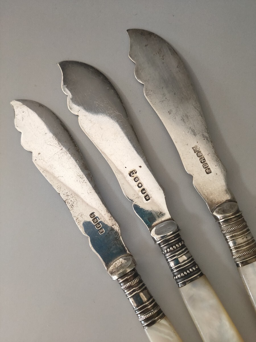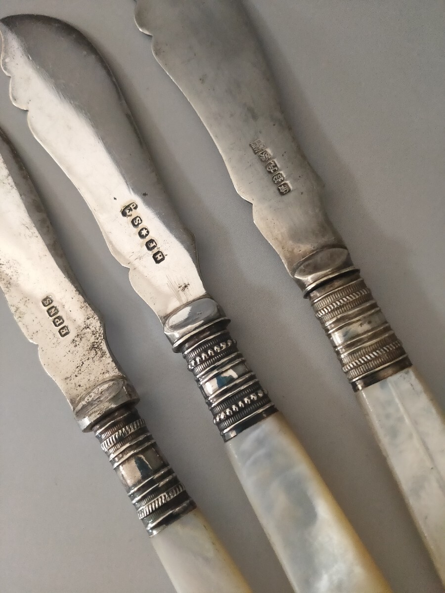 ☆★希少★☆ 英国製アンティーク 白蝶貝ハンドル シルバープレート ナイフ 3本set マザーオブパール MOP ヴィンテージ (L11.①b)