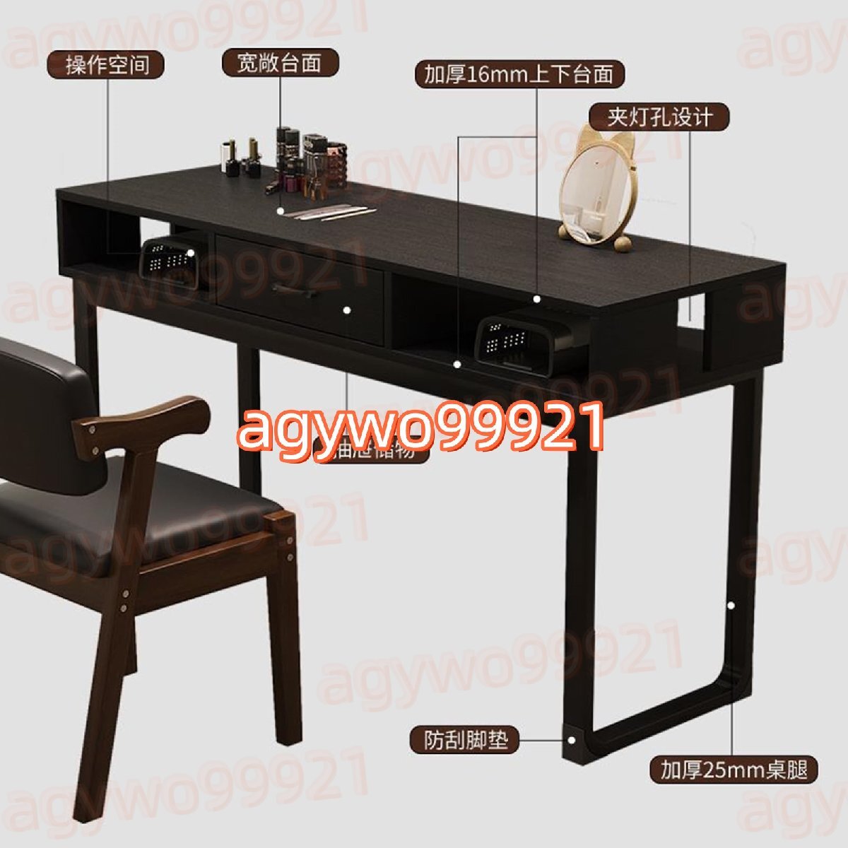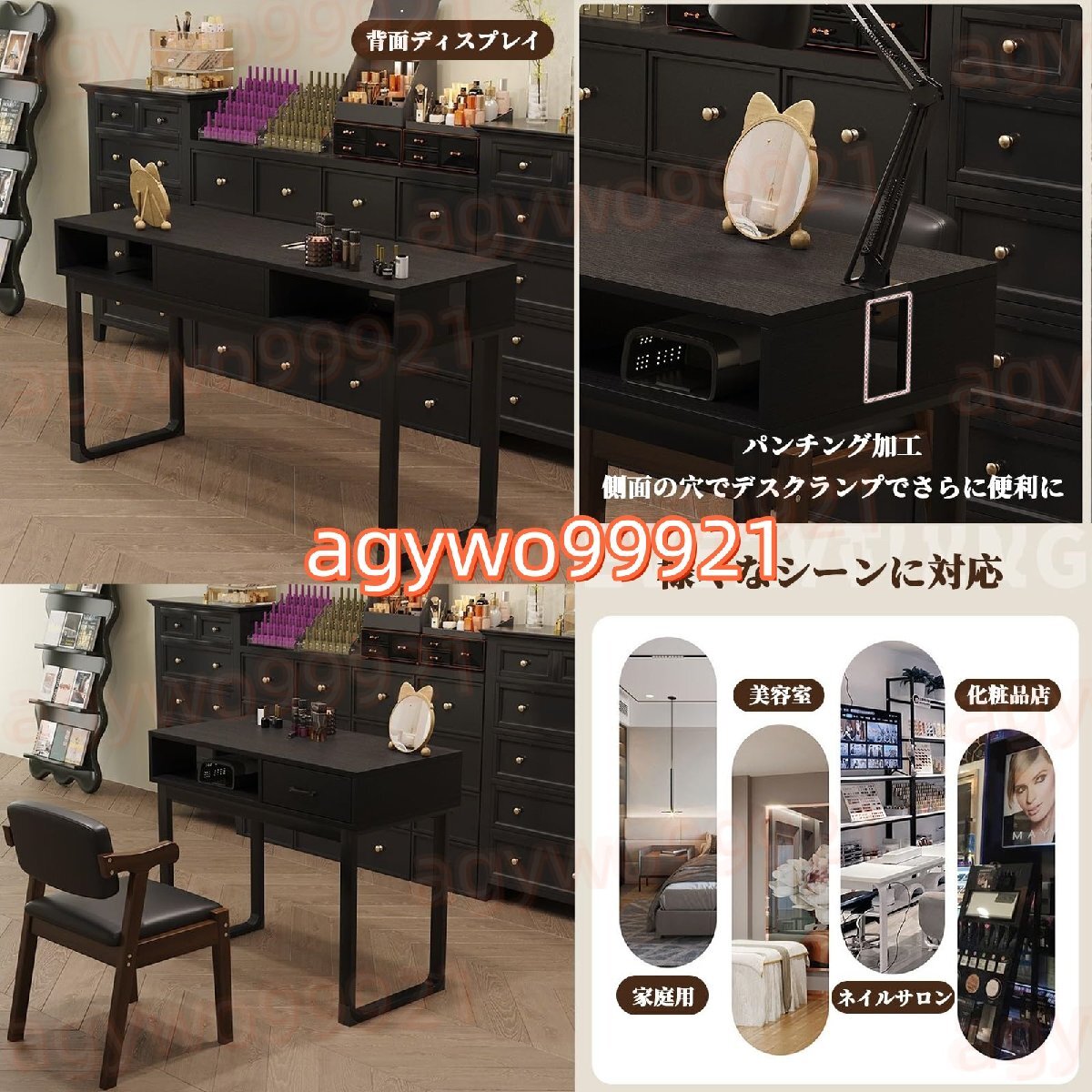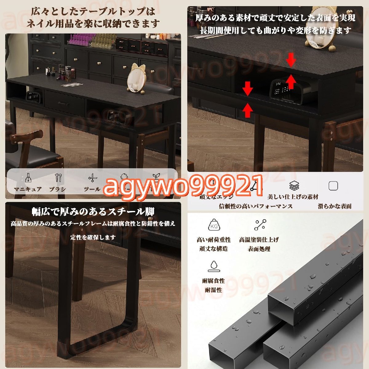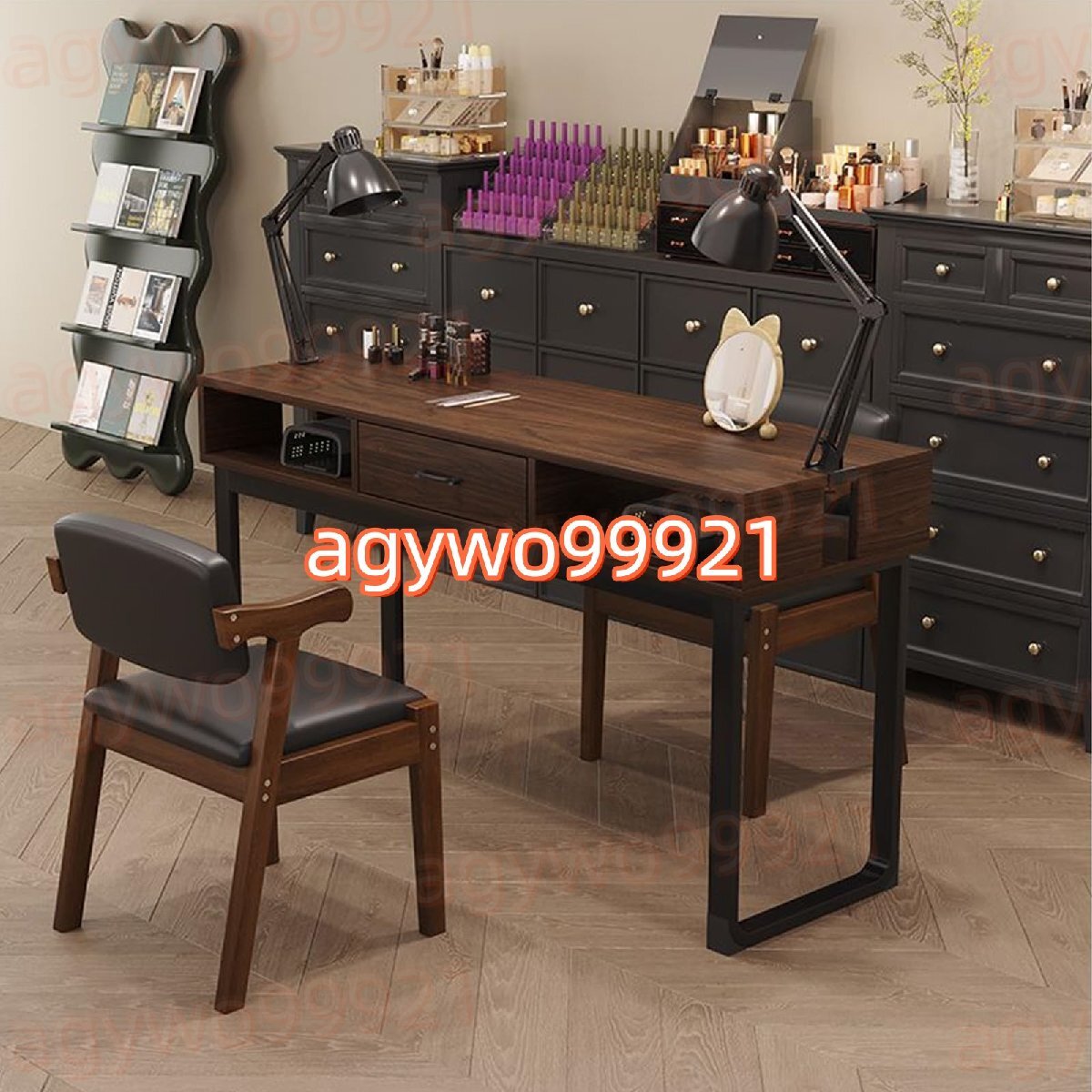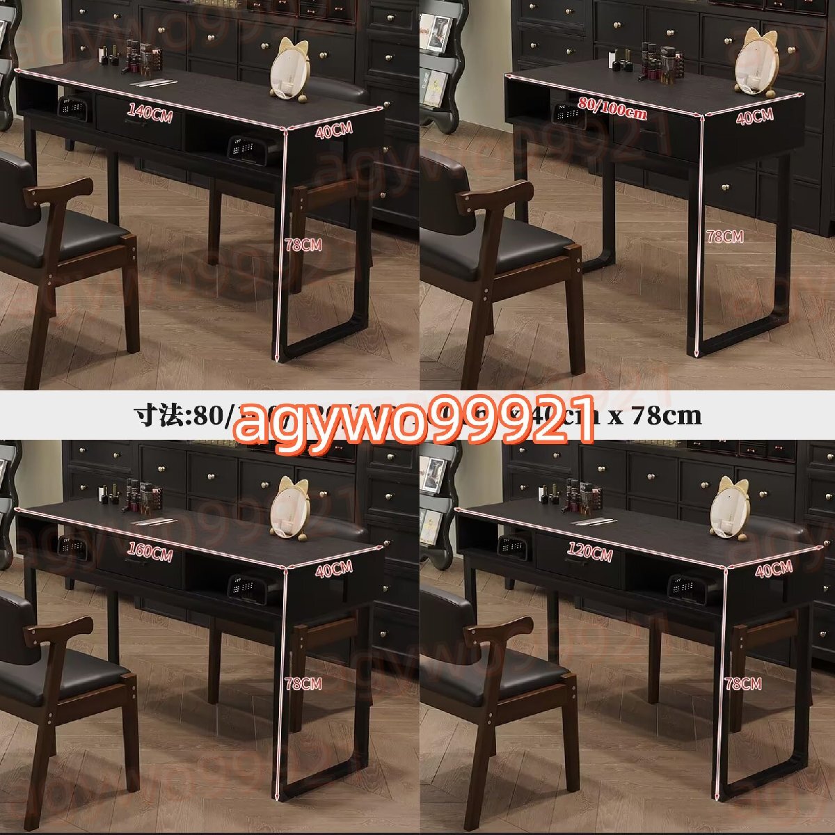 1. レトロ風のおしゃれなネイルテーブルセット。広々とした操作スペースと収納力抜群の引き出し付き設計で、ネイル用品をすっきり整理。ランプ対応の便利な孔設計、頑丈なスチール脚と安全な丸角仕上げで、長時間の作業も安心。美容院から家庭用まで幅広く活躍し、空間を格上げする理想的なサロンデスクです。2. 製品名: ネイルテーブル、マニキュアテーブル、ネイル サロン デスク、ネイルメイク作業台、二重層収納 ネイルデスク、ネイルサロン専用テーブル、スパ ネイルデスク、勉強デスク、ワークテーブル、会議テーブル、ミーティングテーブル取り付け:簡単な組み立てサイズ:ネイルテーブル:80/100/120/140/160CM X 40CM X 78CM材質:木製+スチールフレームカラー: ウォールナット、ブラック利点と特徴:多層収納+引き出しデザイン/安定性と耐久性、強力な耐荷重性、変形しにくい/丸みを帯びた角、衝突防止/滑り止めフットパッド、安定性と揺れ防止/マルチシーンアプリケーション:美容院、ネイルサロン、家庭で使用でき、実用的で多用途です。3. さまざまなシナリオに適用可能ネイルサロン:お客様が座って、広々とした天板でジェルネイルやアートを丁寧に施術。収納スペースにはカラージェルやツールを整然と保管。美容院・エステサロン:待ち時間にハンドケアや簡単なネイルケアを提供し、ワンランク上のサービスを演出。ホームサロン:自宅で友人を招いて、会話しながらネイルを楽しむ。限られた空間でも収納力抜群で散らからない。化粧スペース:ドレッサーとしても活躍。コスメやアクセサリーを引き出しに収納し、毎日のメイク時間を快適に。趣味の作業台:ハンドクラフトやアクセサリー作りにも利用可能。天板で汚れてもサッと拭き取れて清潔。4. パッケージ内容: ネイルテーブル X1(椅子は付属しておりません)