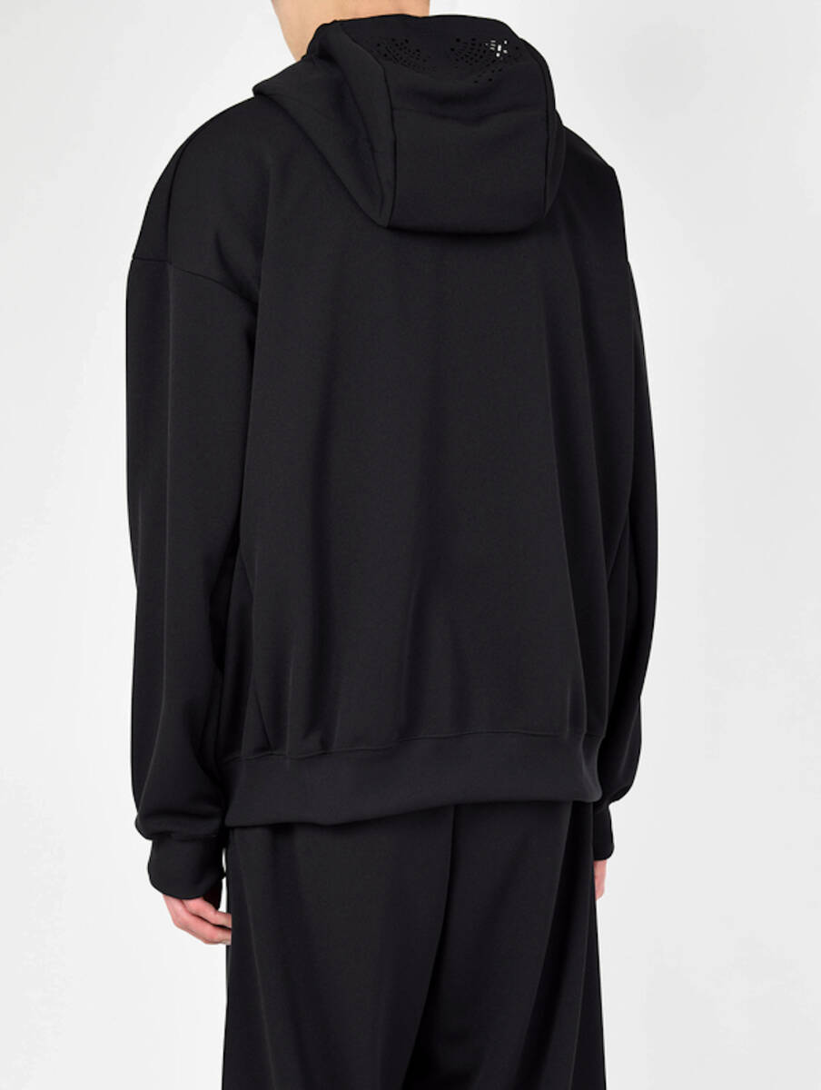 アイテムで、上質なエステルジャージを使用し、フーデッドブルゾン型、オーバーサイズ、動きやすいフリーダムスリーブ、フードのレザーカット、2ポケットなど、細部まで凝ったデザインです。