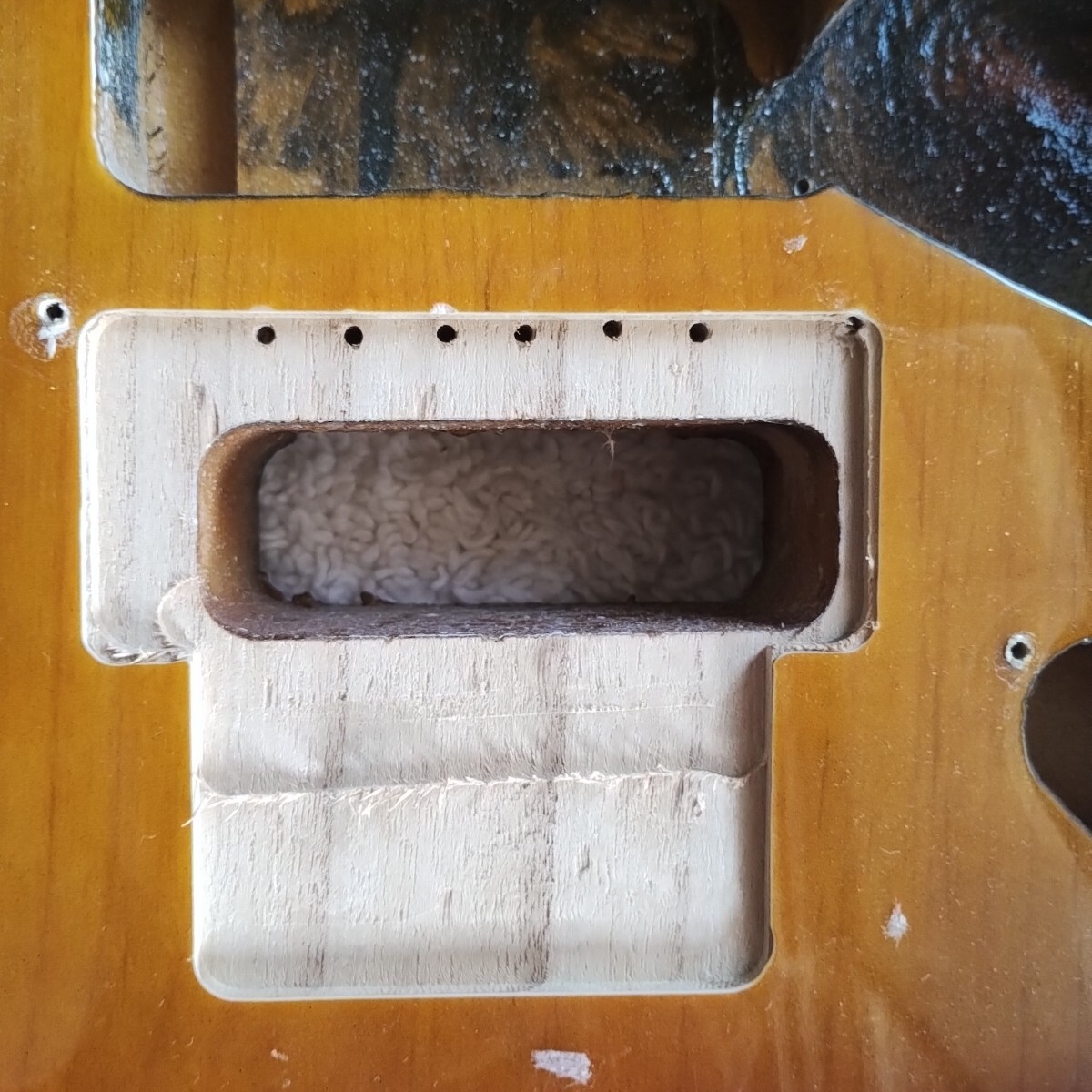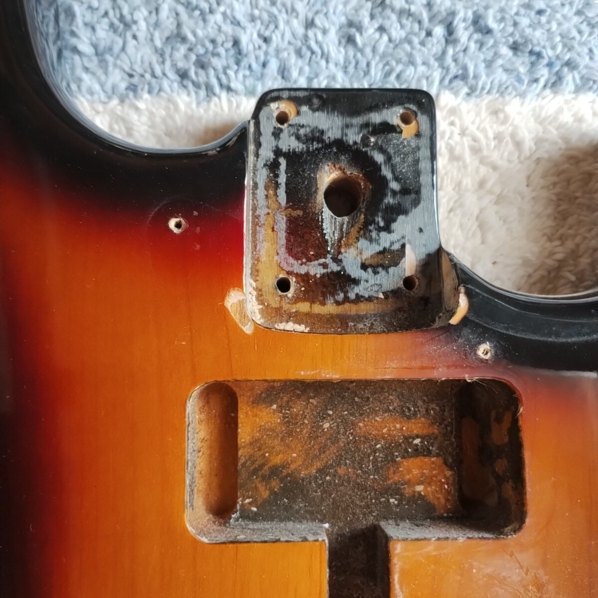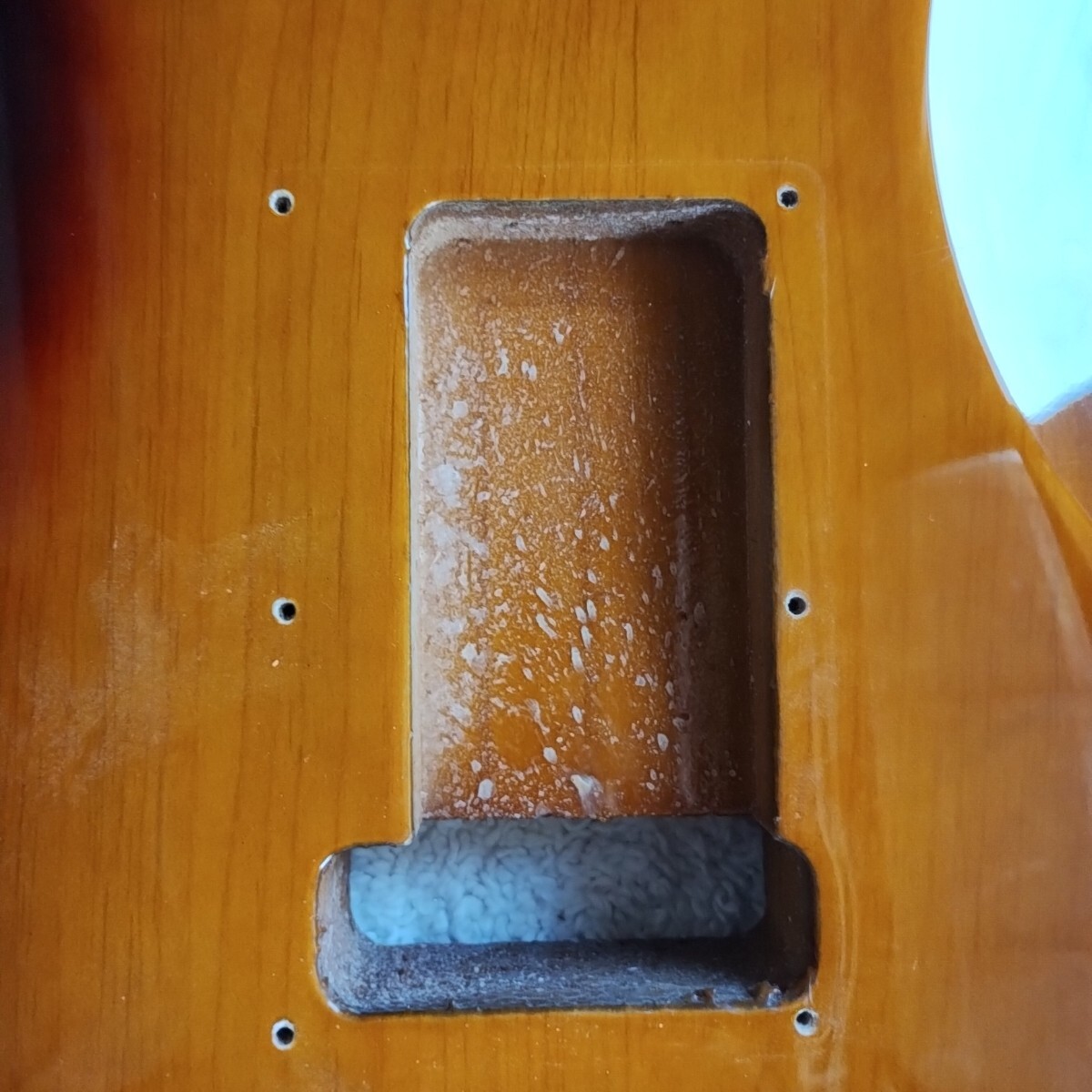 フロイド・ローズ取り付け用のざぐり、材質はバスウッドかアルダー辺りだと思います。
