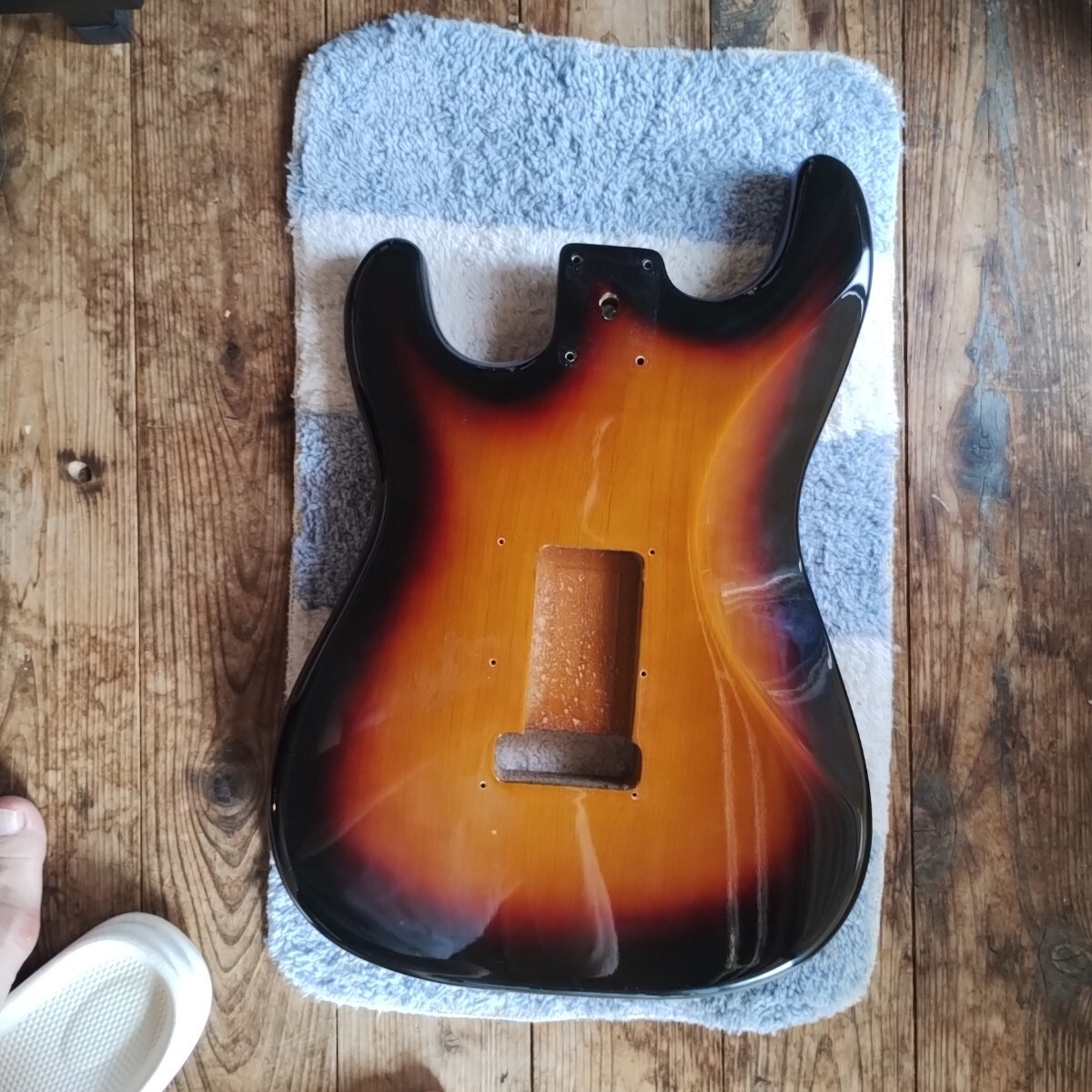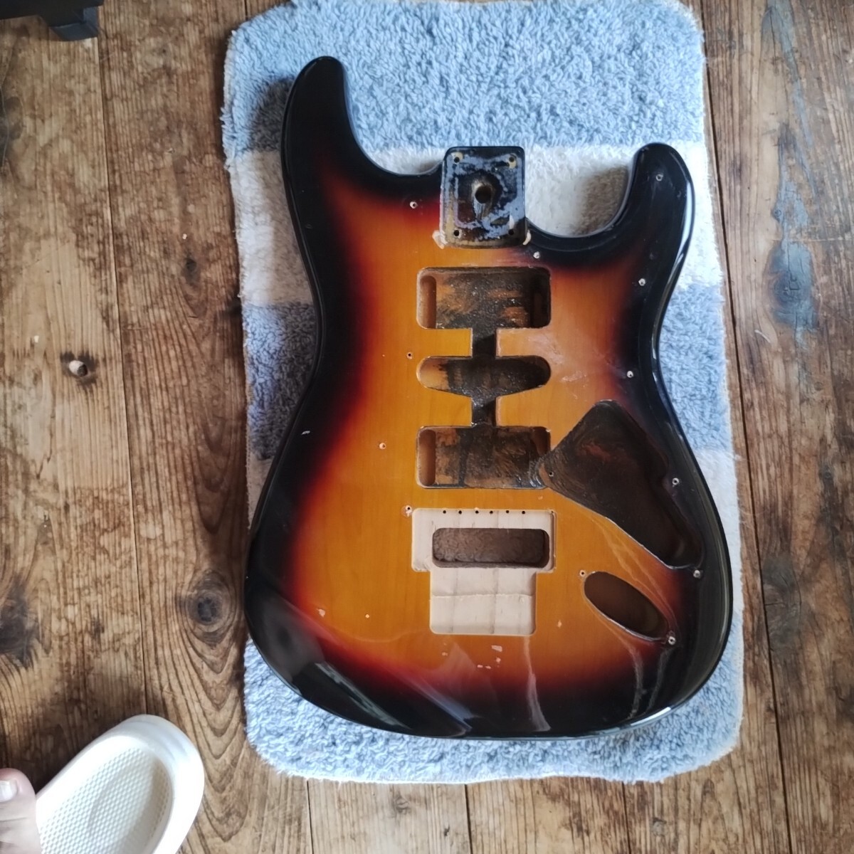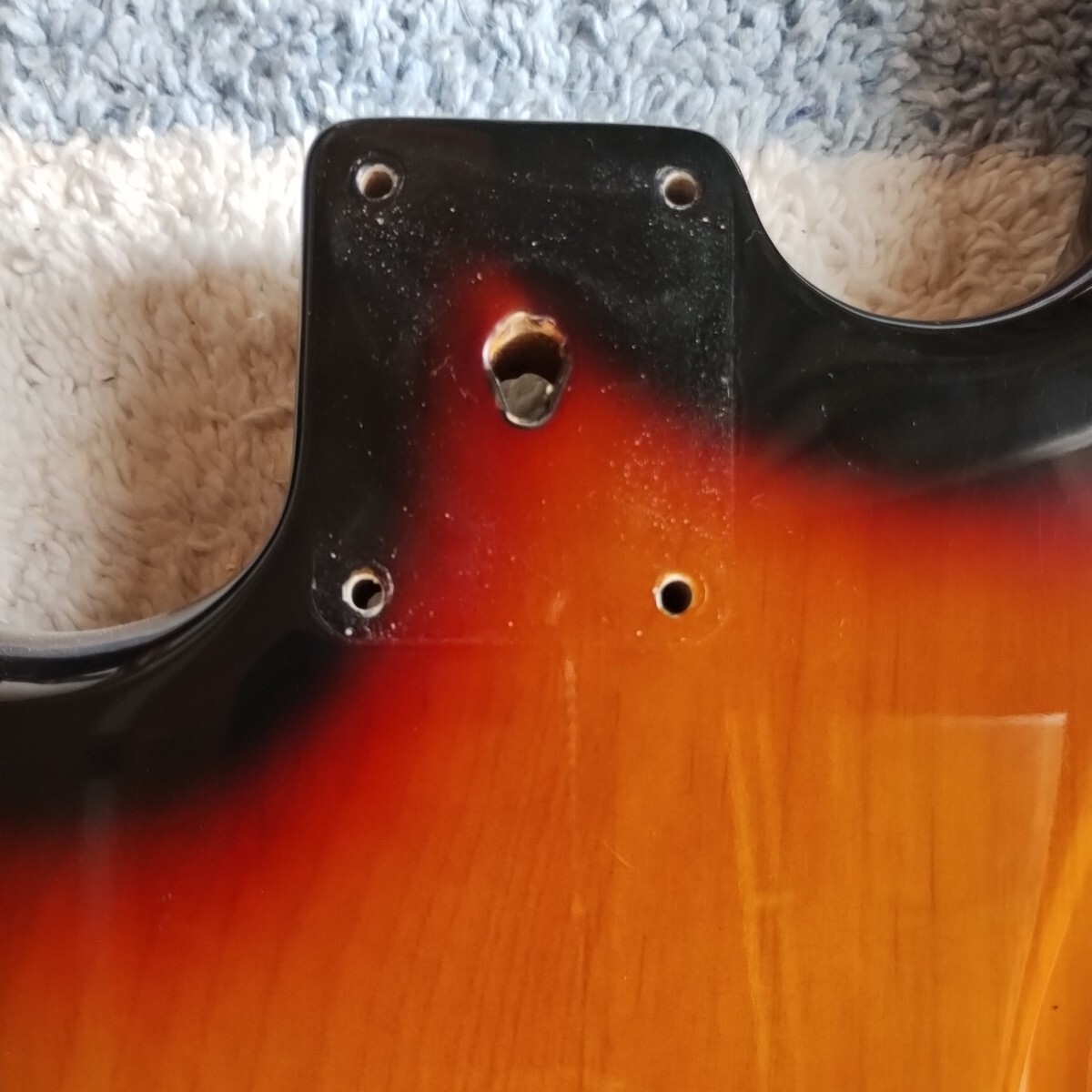 フロイド・ローズ取り付け用のざぐり、材質はバスウッドかアルダー辺りだと思います。