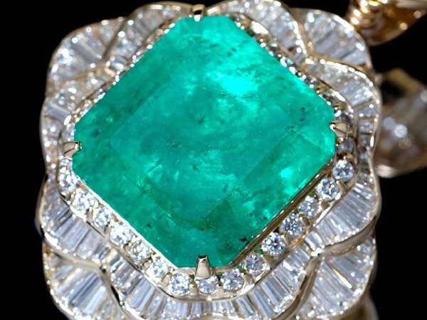 エメラルドの周りを飾る天然ダイヤモンドも、極上のお石をなんと総計9.156ctも極上セッティングし、エメラルドの高級感を最大級に惹きたてています!< ギラギラと極上の輝きを放ち、VSクラス以上の透明感を魅せ、ダイヤモンドだけでも圧倒的な高級感ですね!