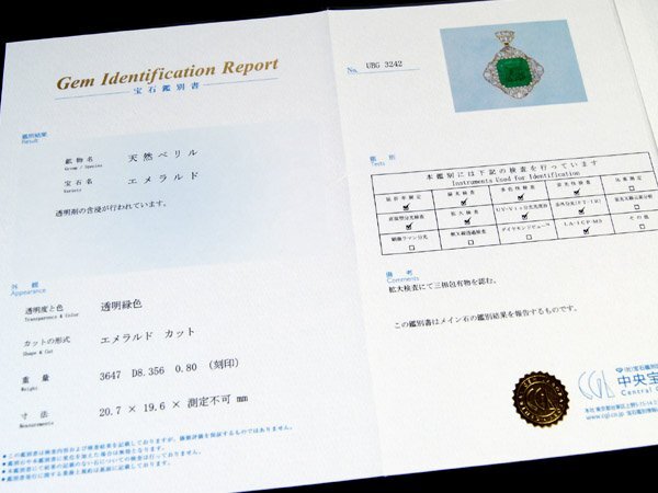 中央宝石研究所発行の産地付き分析表・宝石鑑別書付属