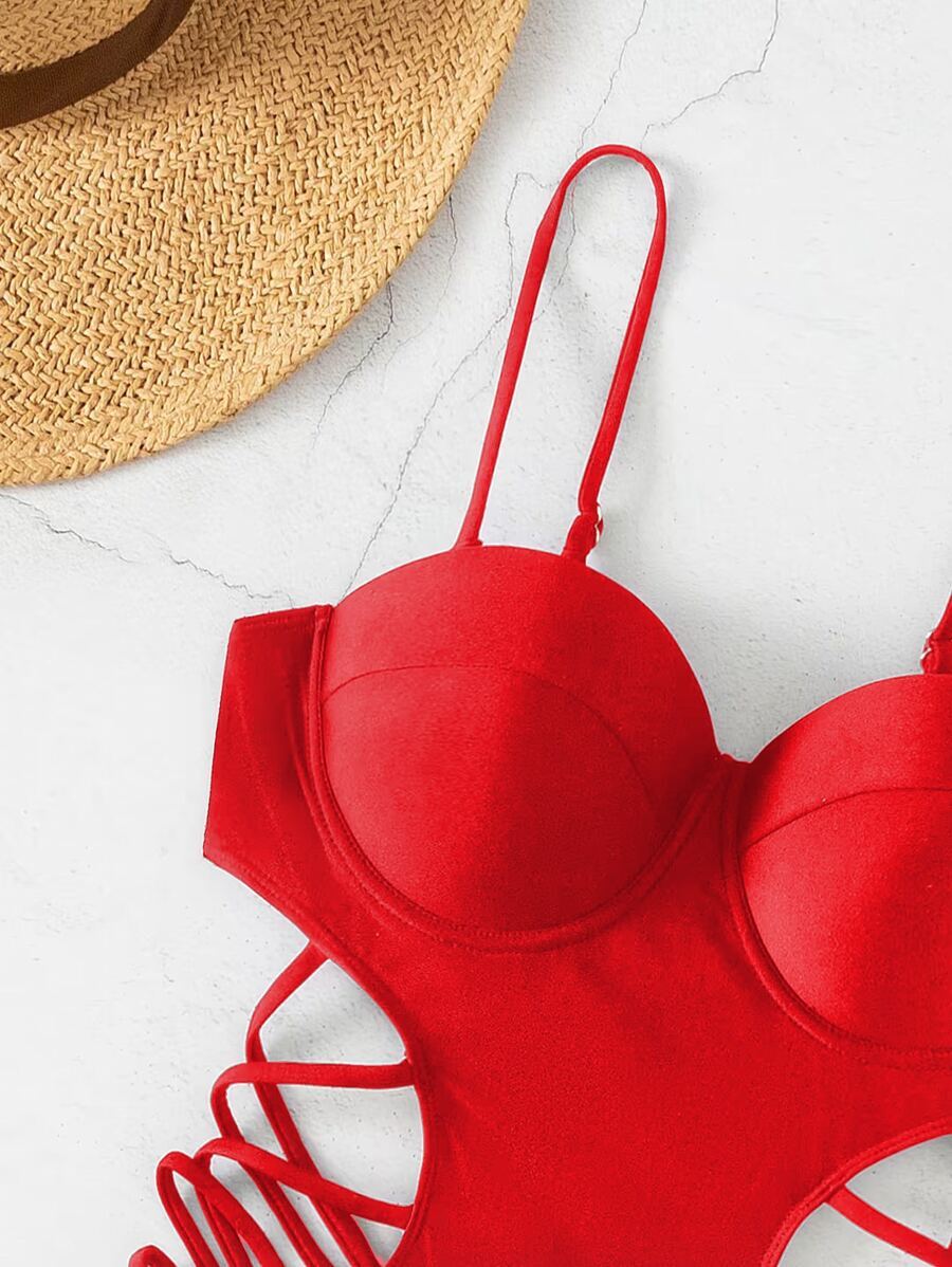 レディース 水着 ワンピース 2025年 レディース 無地 ホールアウト スパゲッティストラップ ワンピース プッシュアップ水着