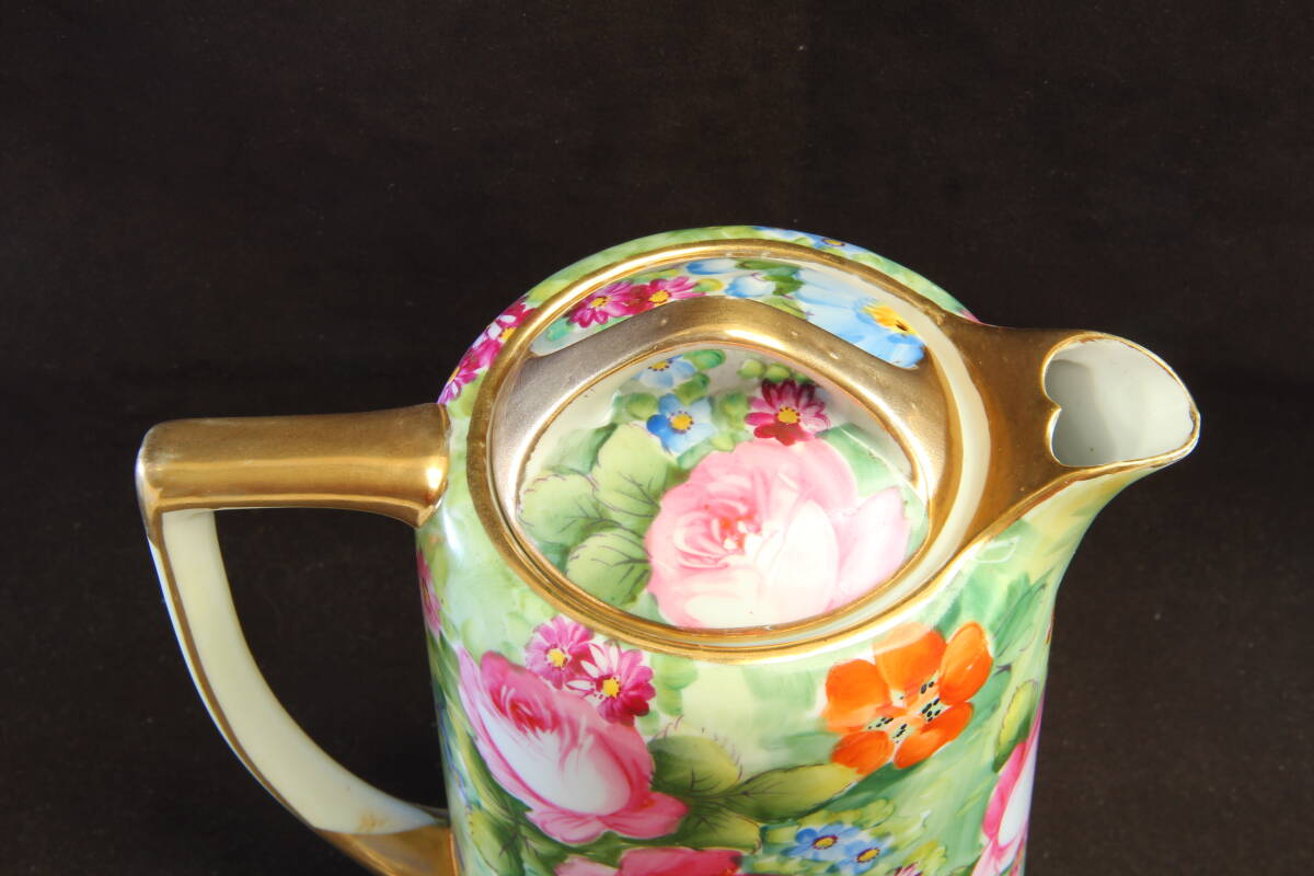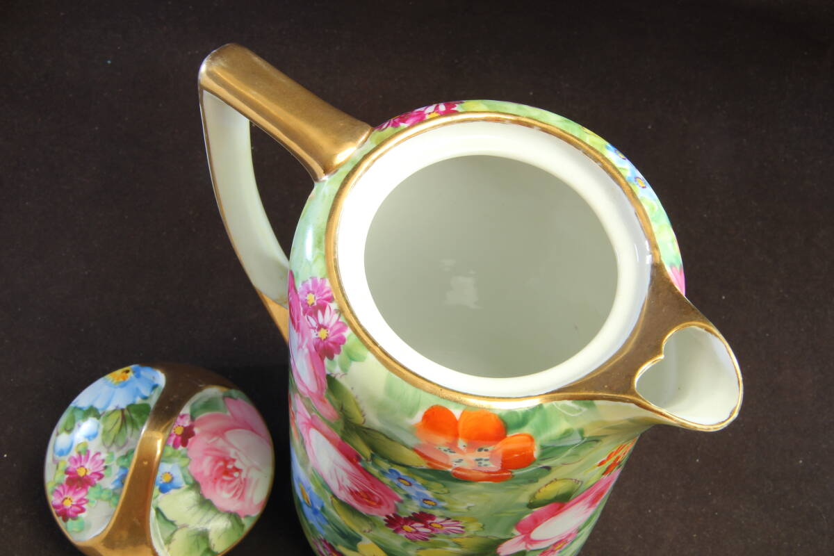 3864 オールドノリタケ チョコレートポット メープルリーフNIPPON 明治 金彩縁飾と薔薇の華模様