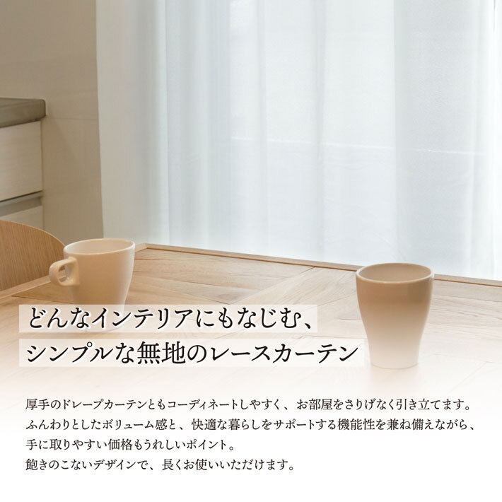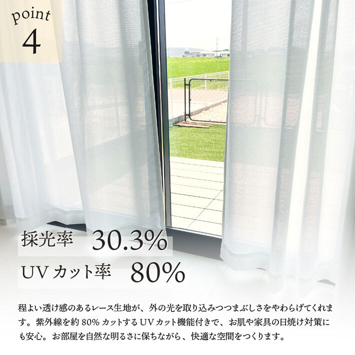 ■採光率30.3% UVカット率80%:程よい透け感で光をやわらげ、UV約80%カットで日焼け対策にも安心。