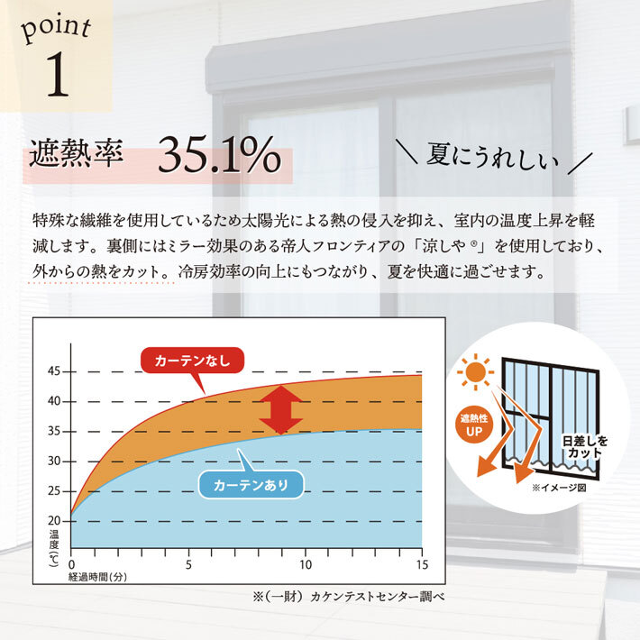 ■遮熱率35.1%:ミラー効果で日射熱をカットし、室温上昇を抑制。冷房効率を高め、夏も快適。