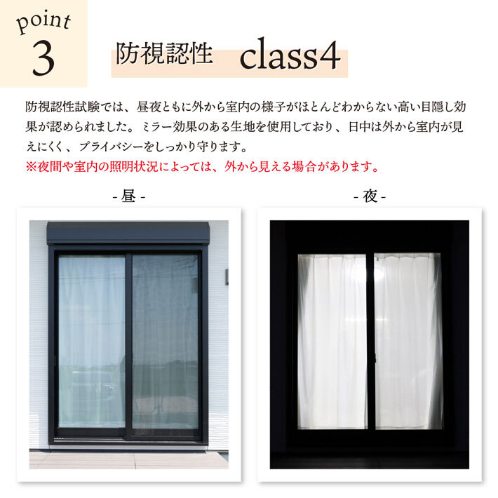 ■防視認性class4:昼夜ともに高い目隠し効果を発揮。日中はミラー効果で外から見えにくく、プライバシーを守ります。