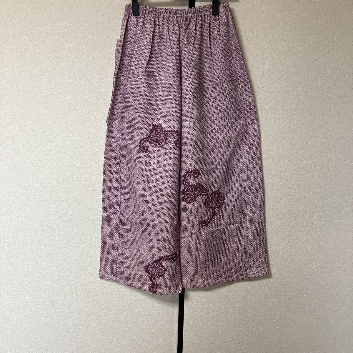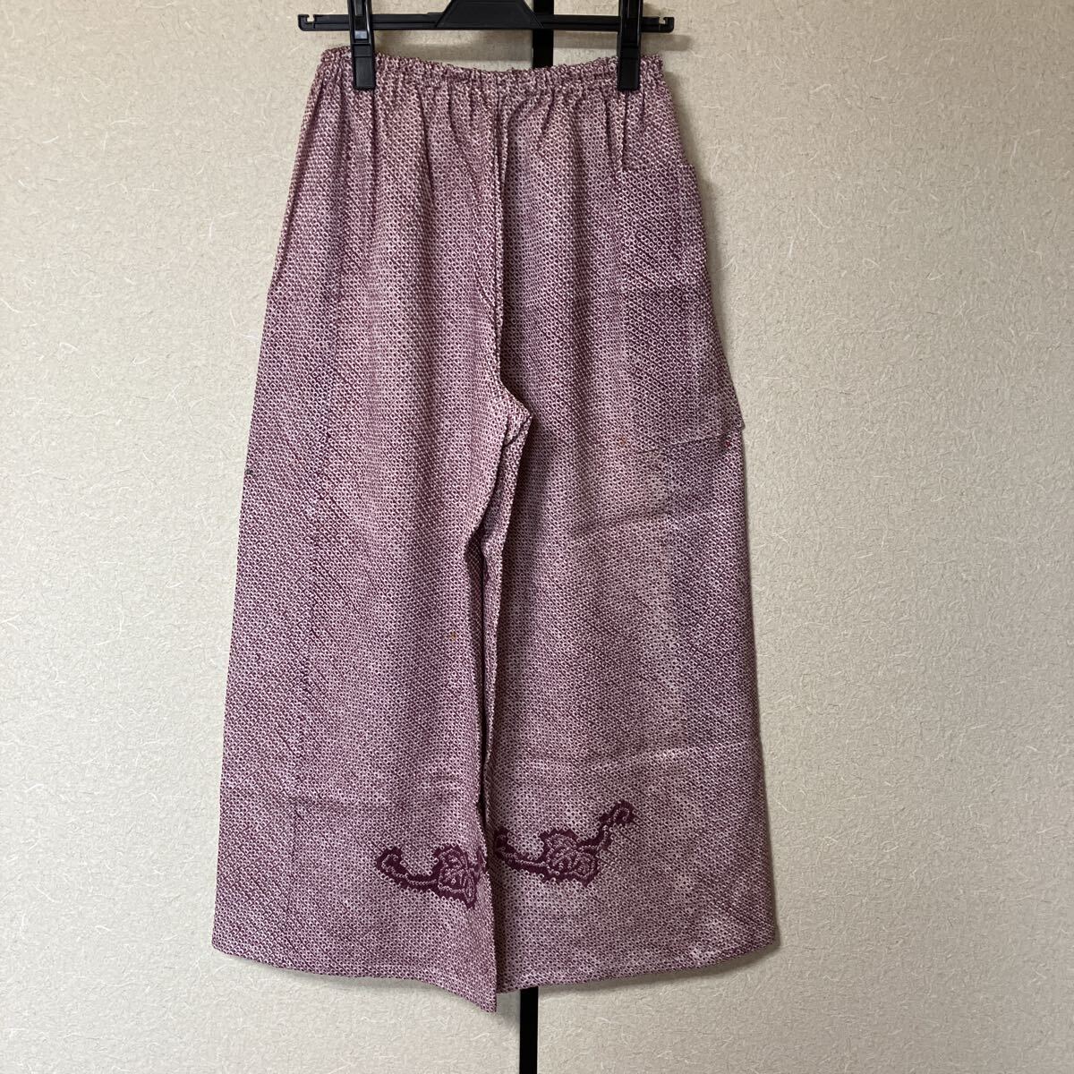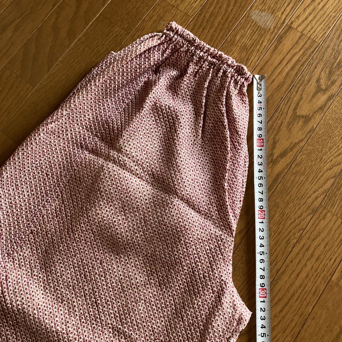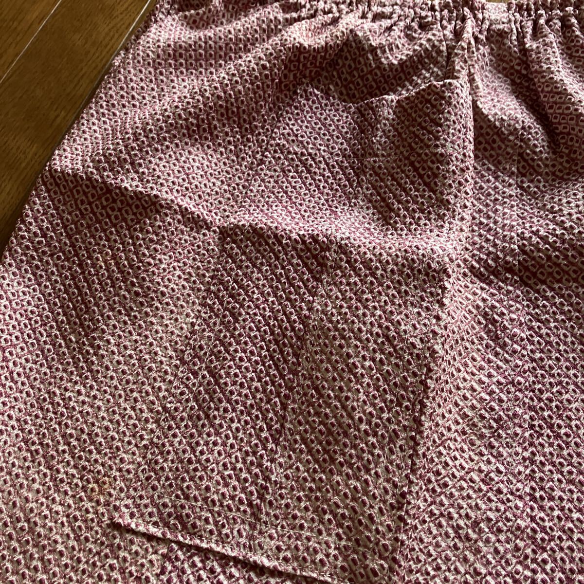 正絹絞りの着物を解いてのパンツです。写真では確認できない程度の小さな茶系のポツポツとしたシミが点在していますがパッと見、わからない程度ですけれど気になる人は入札しないでください。