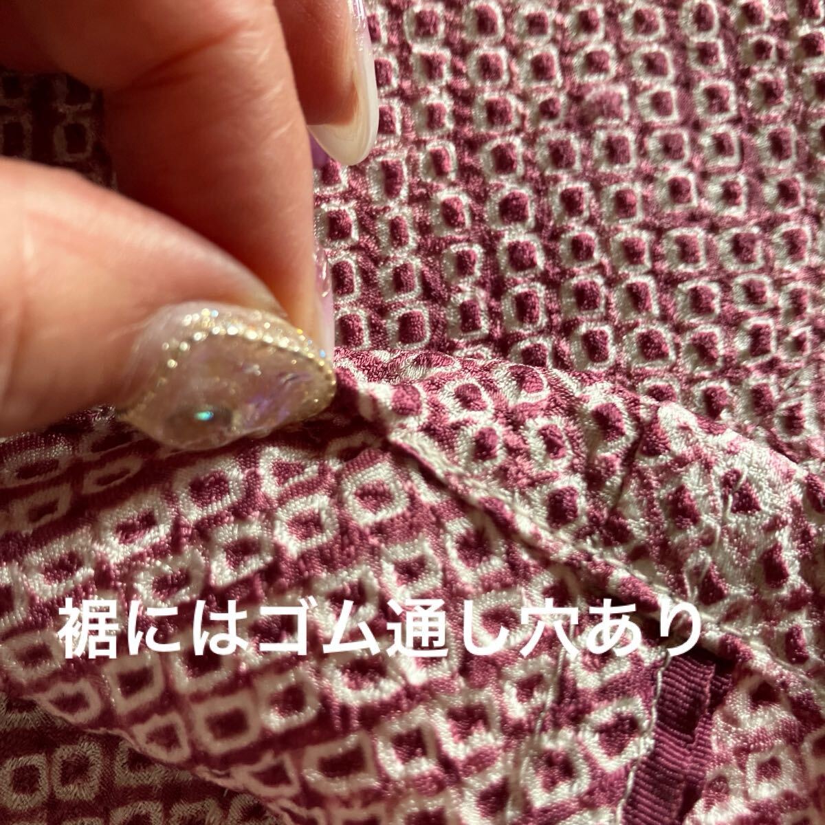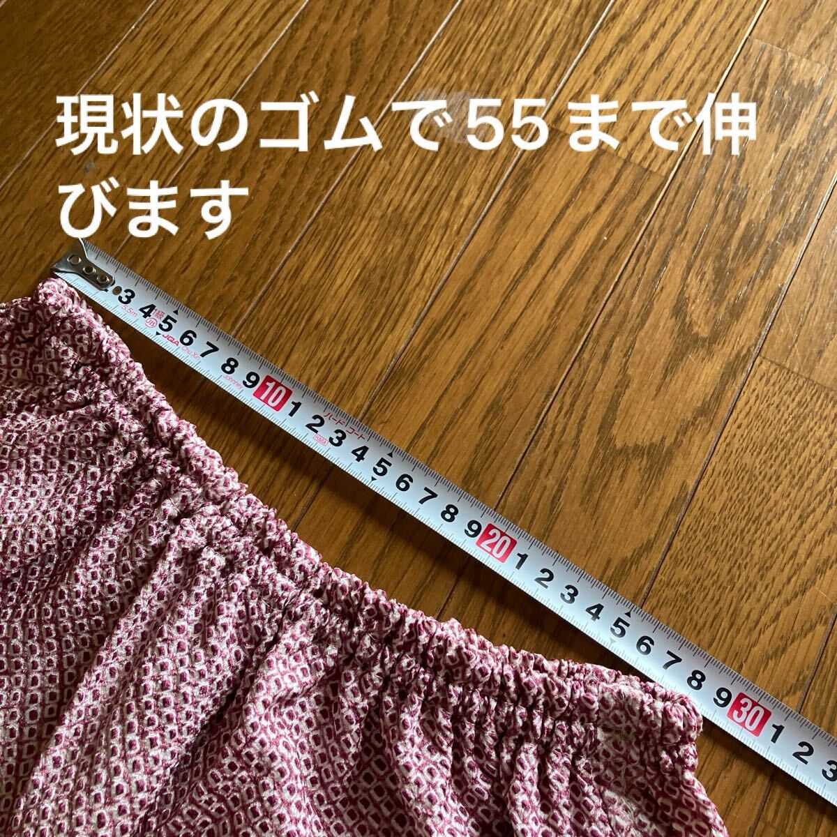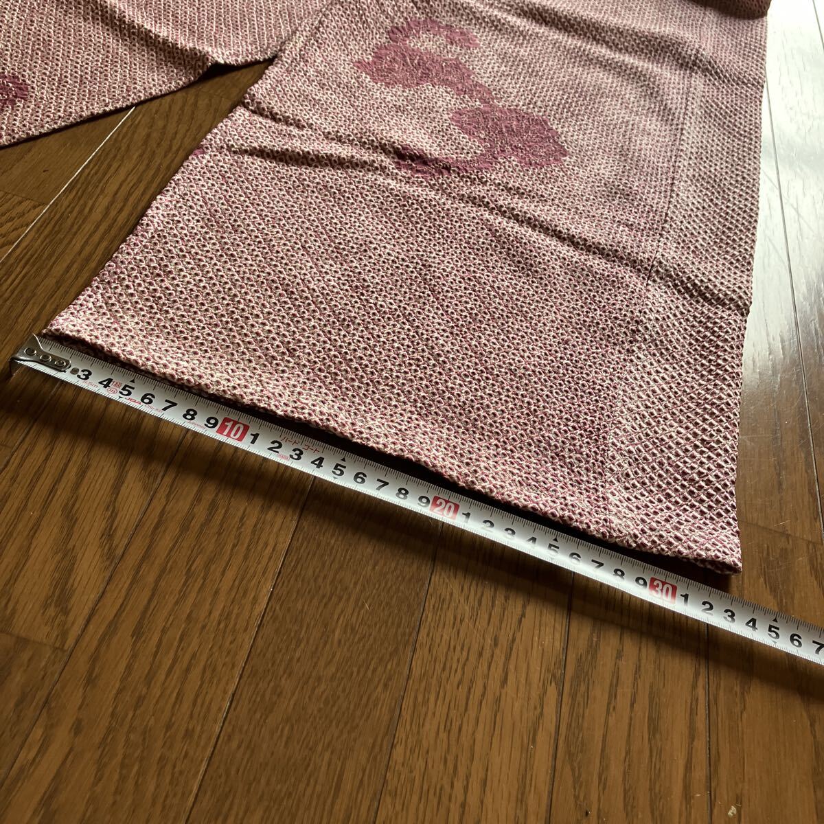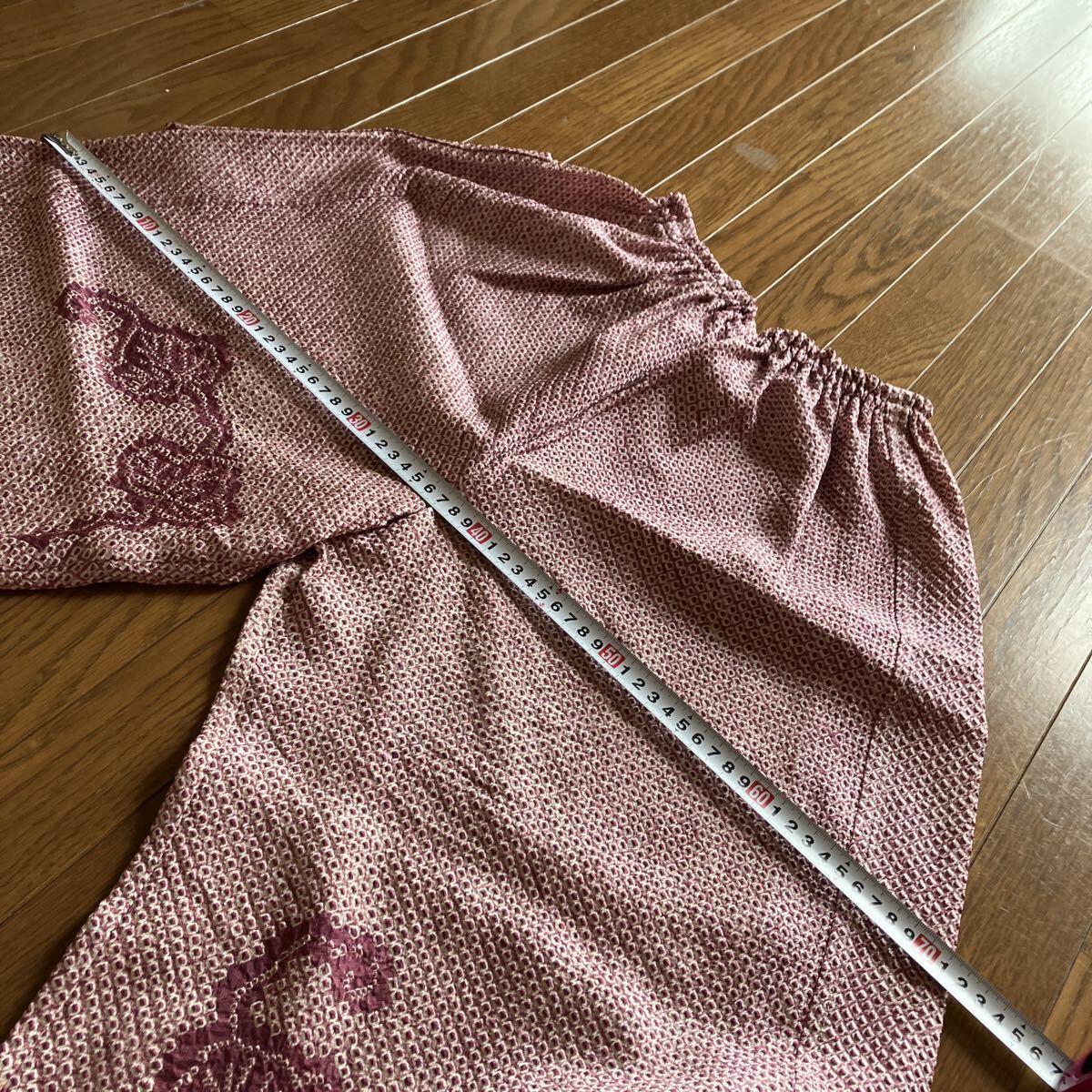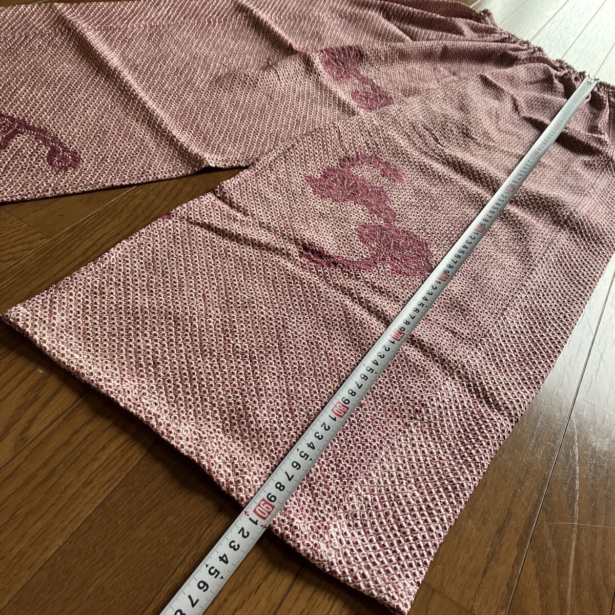 正絹絞りの着物を解いてのパンツです。写真では確認できない程度の小さな茶系のポツポツとしたシミが点在していますがパッと見、わからない程度ですけれど気になる人は入札しないでください。