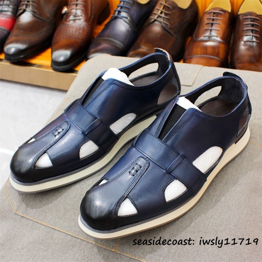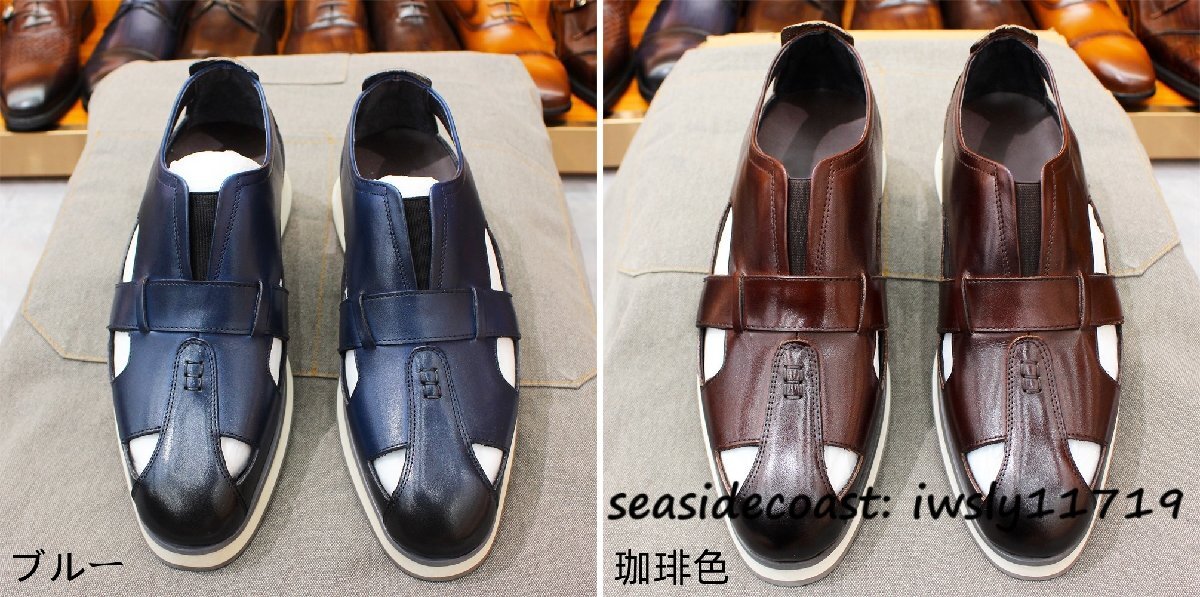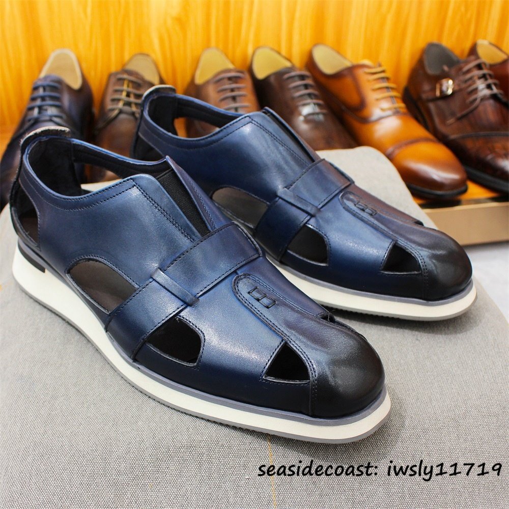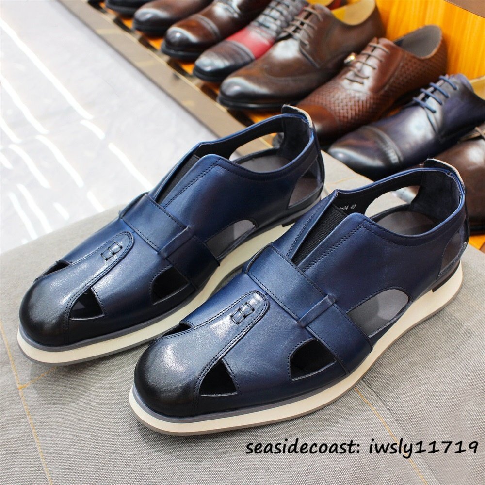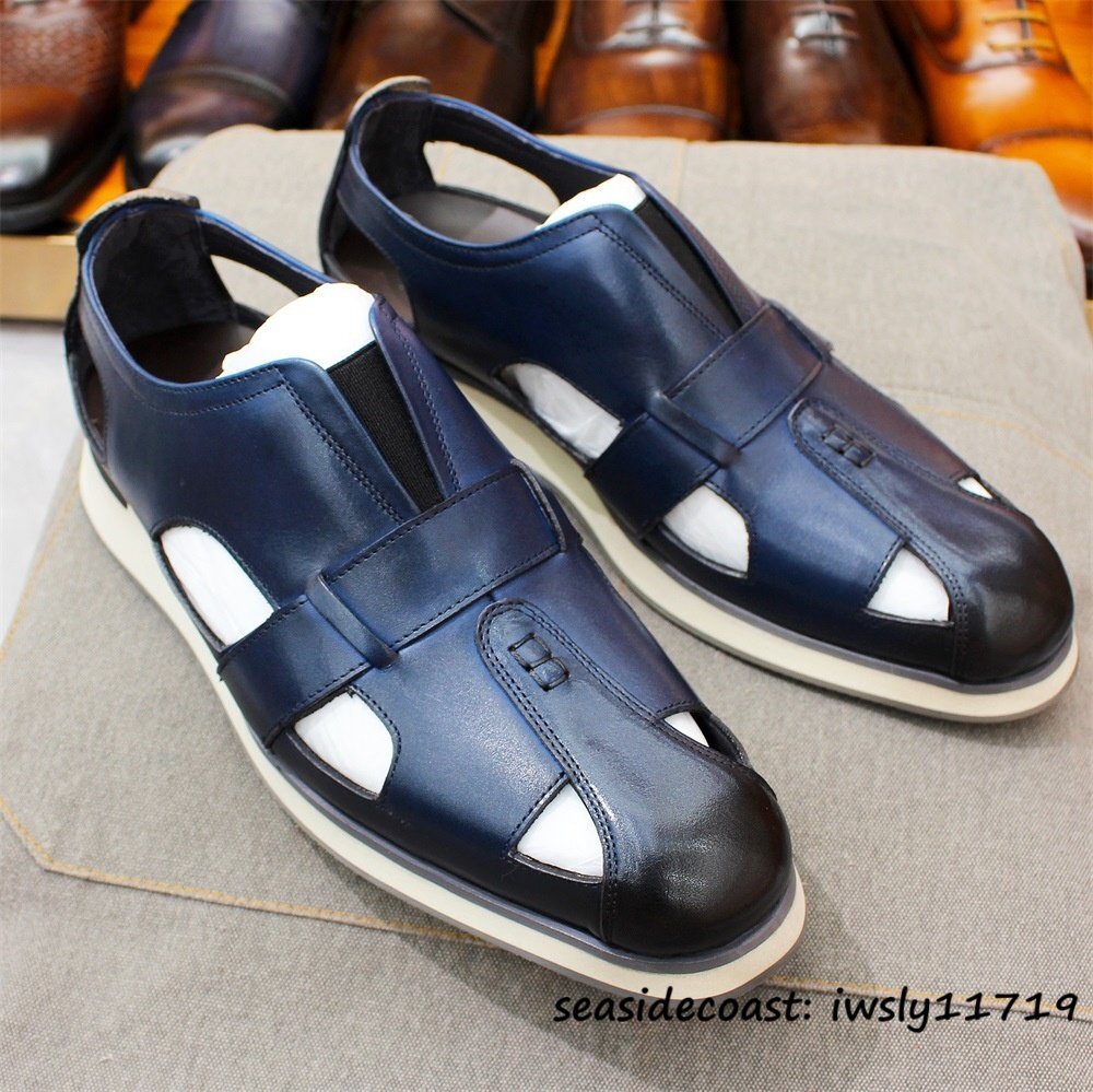 超希少■サンダル 本革 透かし彫り レザーシューズ 職人手作り 高級本革 紳士靴 革靴 ビジネスシューズ スリッパ レトロ ブルー 27.5cm