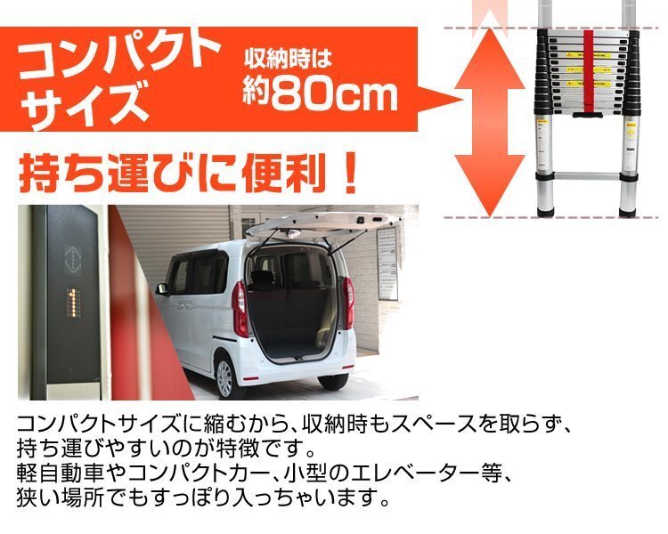 | アルミ製スーパーラダー新型 使用時には段階毎に引き伸ばし、必要な高さでロックできます。 コンパクトで持ち運び楽々。乗用車のトランクにもすっぽり入ります。 庭のお手入れ、高所作業に大活躍 底部は地面をしっかり捉える円すい面を採用 段落ちしない安全ロック付。1段ごとに必要な高さに調節可能。。 ■商品使用 全長(約)373cm~80cm 全幅(約)48.5cm 奥行(約)8.5cm 製品質量(約)11kg 階段:13階段 最大積載重さ(約):150kg 素材 : アルミ ※写真と実物は多少異なる場合がございます。あらかじめご了承下さい。 |