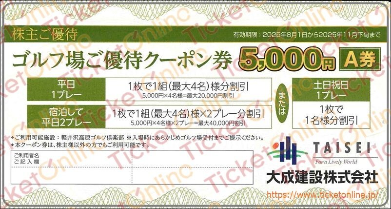 【2025年11月下旬まで】大成建設(ゴルフ優待5,000円券)A券(最大4名様2プレー分4万円割引)2025年11月下旬まで