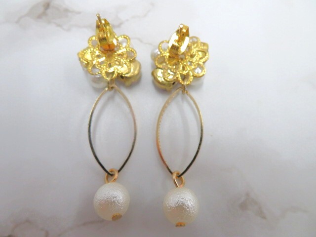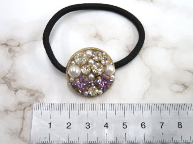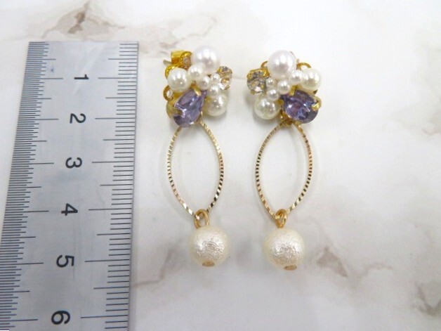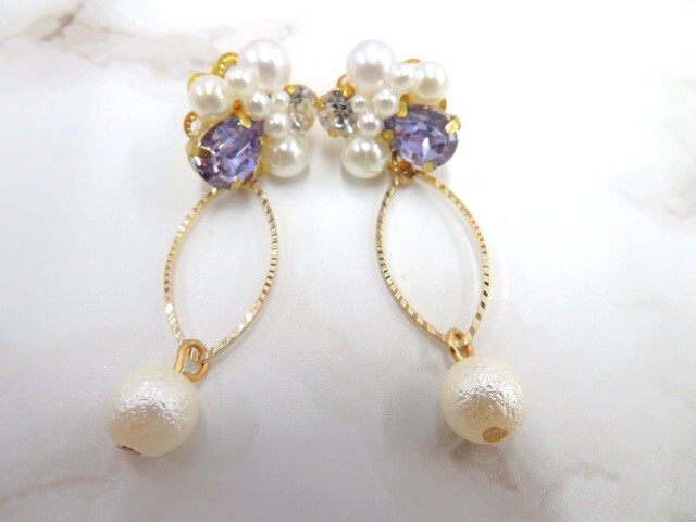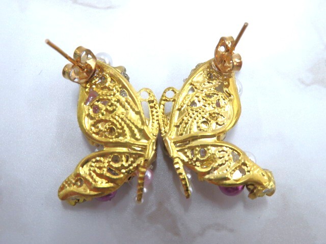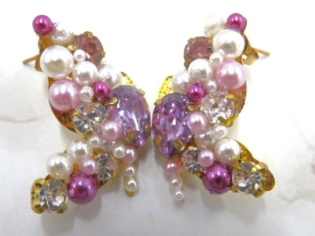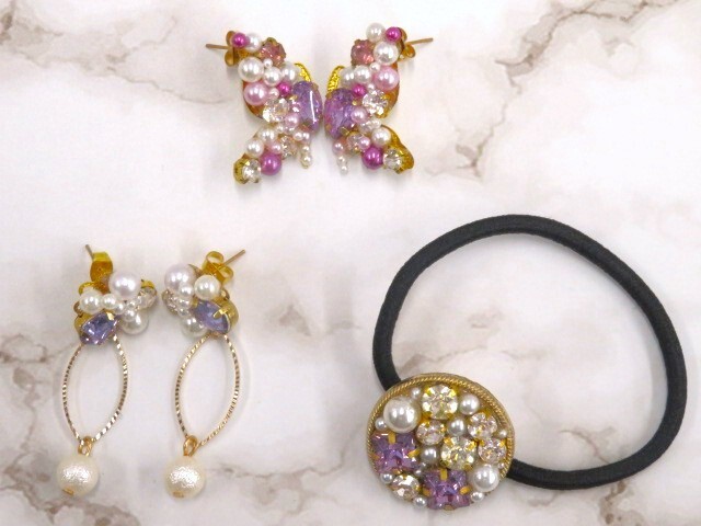 未使用 ハンドメイド 蝶 花モチーフ ピアス2点 & ヘアゴム1点 計3点 キラキラ パールビーズ 色 紫 ピンク 青 かわいい