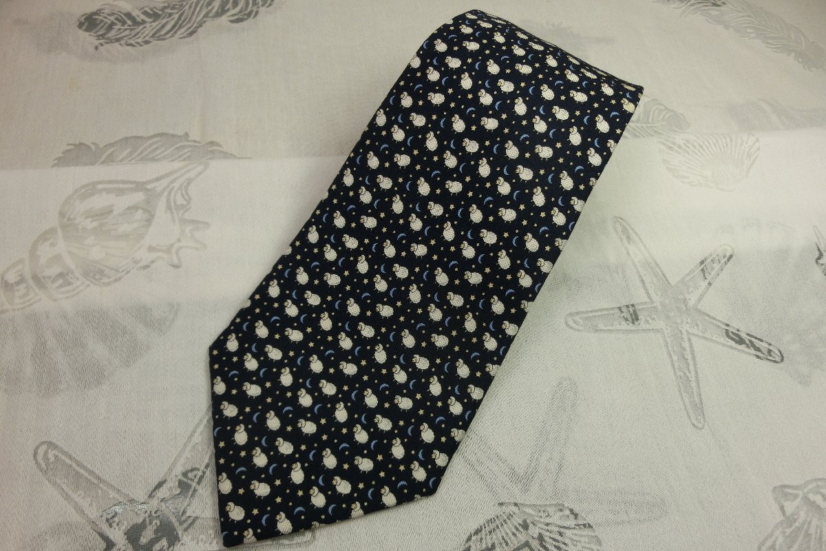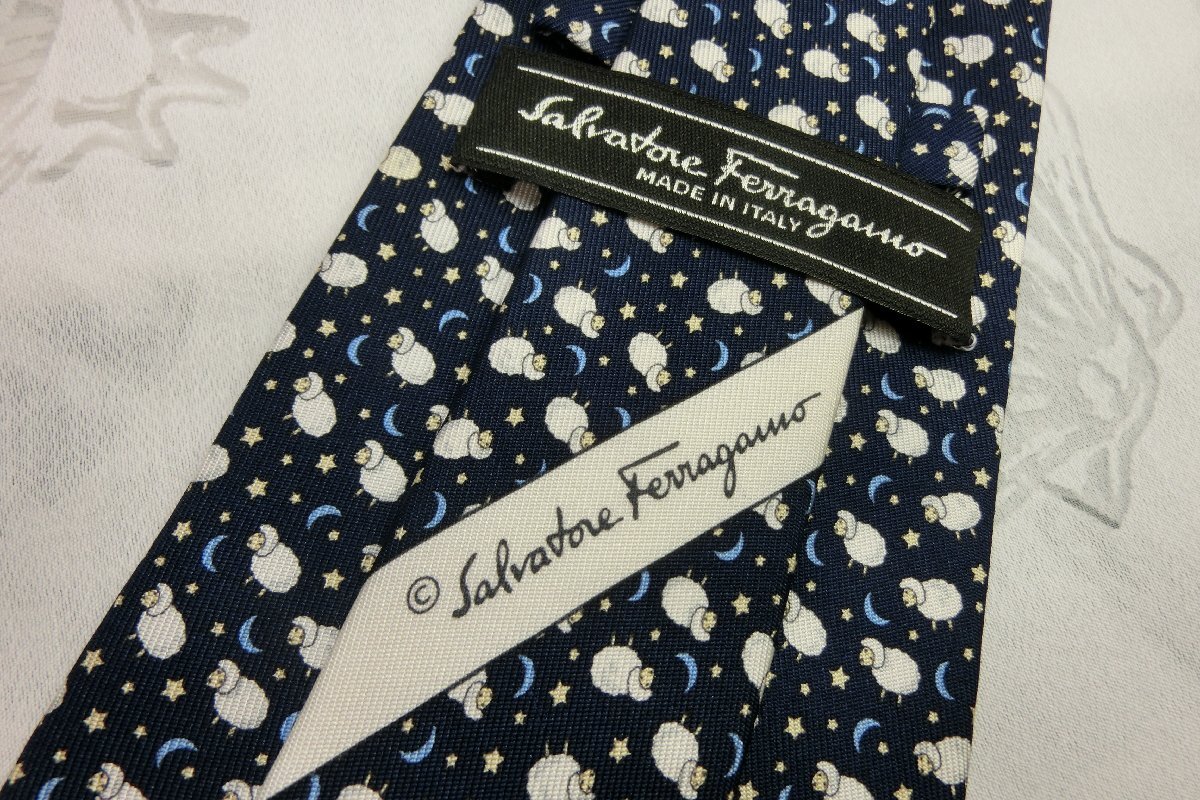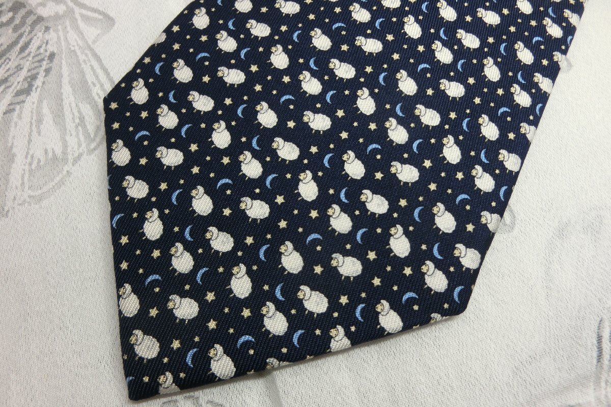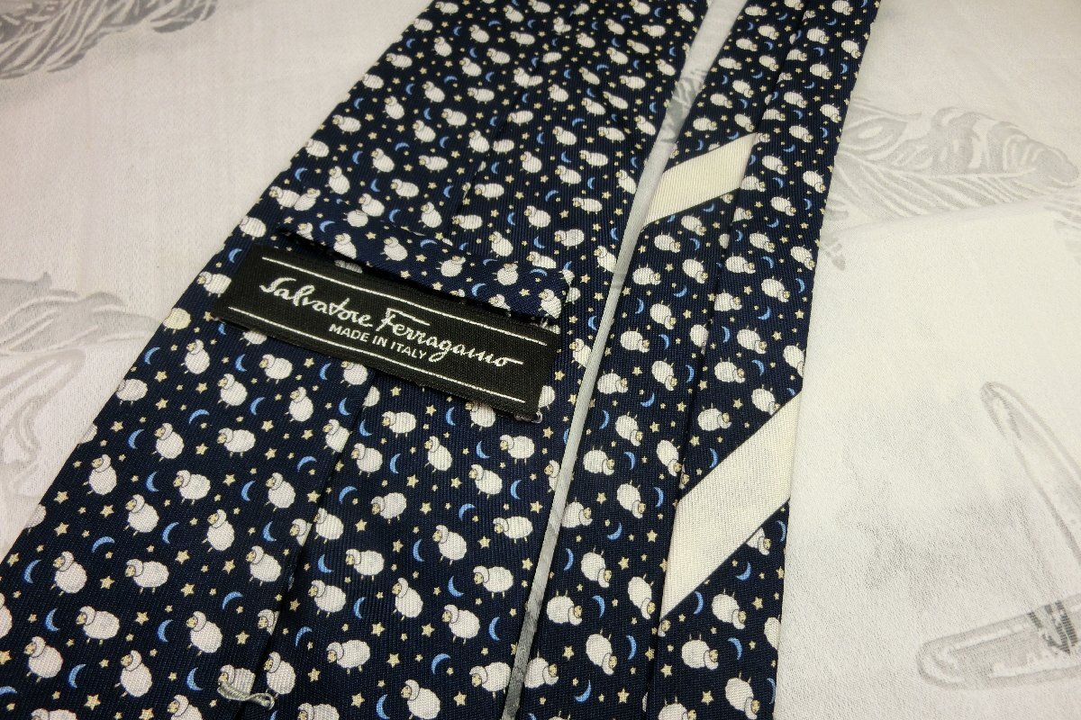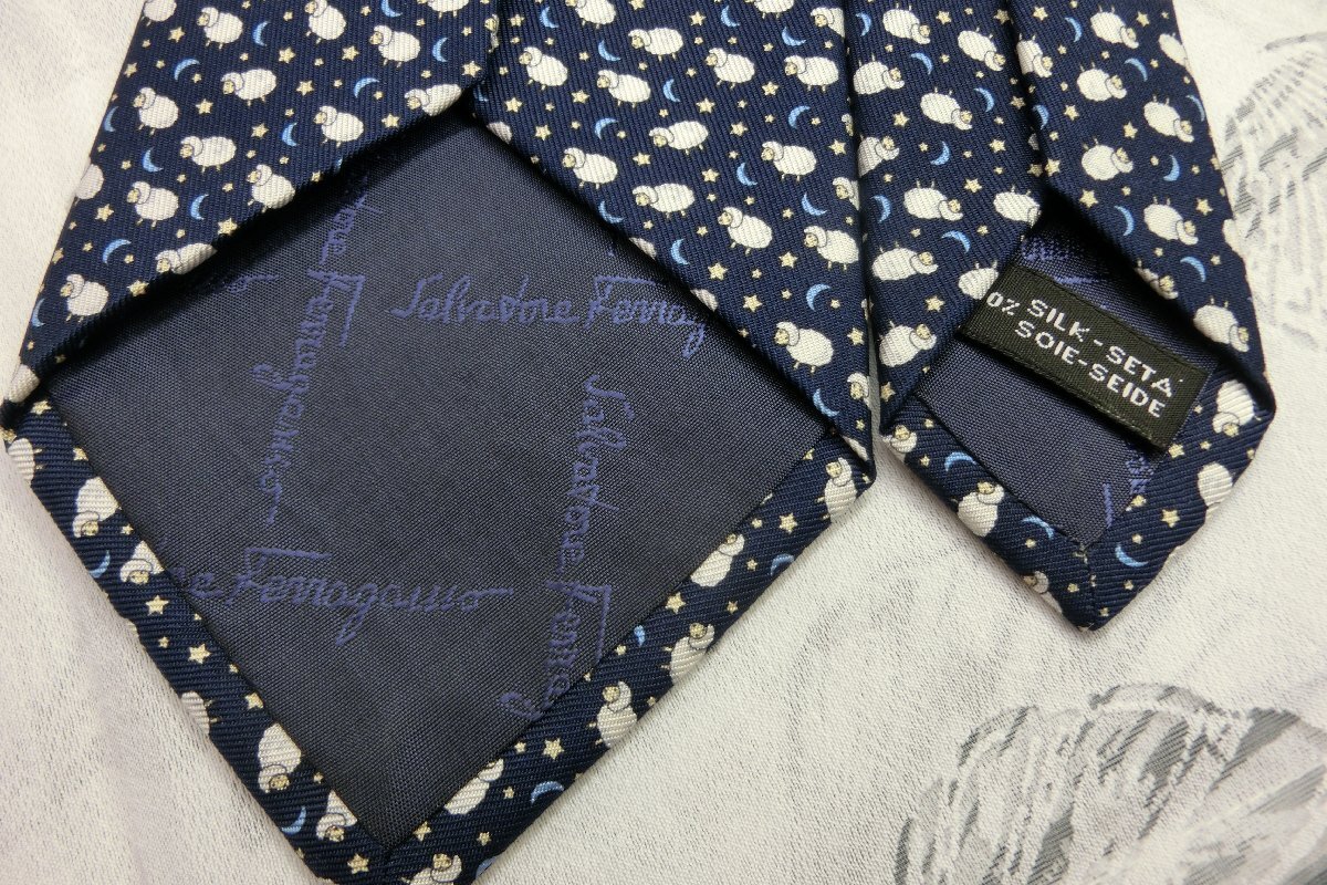 ★Salvatore Ferragamo/サルヴァトーレ・フェラガモ★ネイビー月夜の総柄ひつじデザインシルクネクタイ★美品 正規品