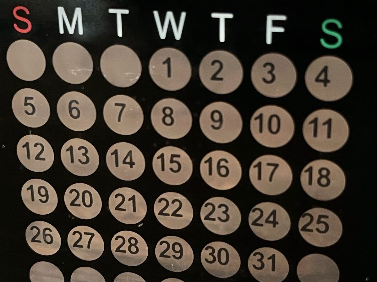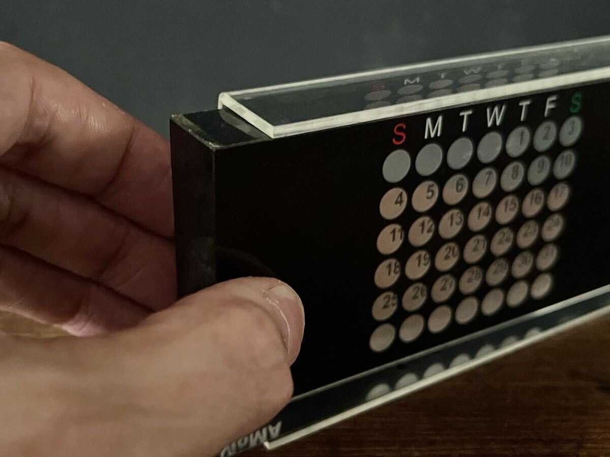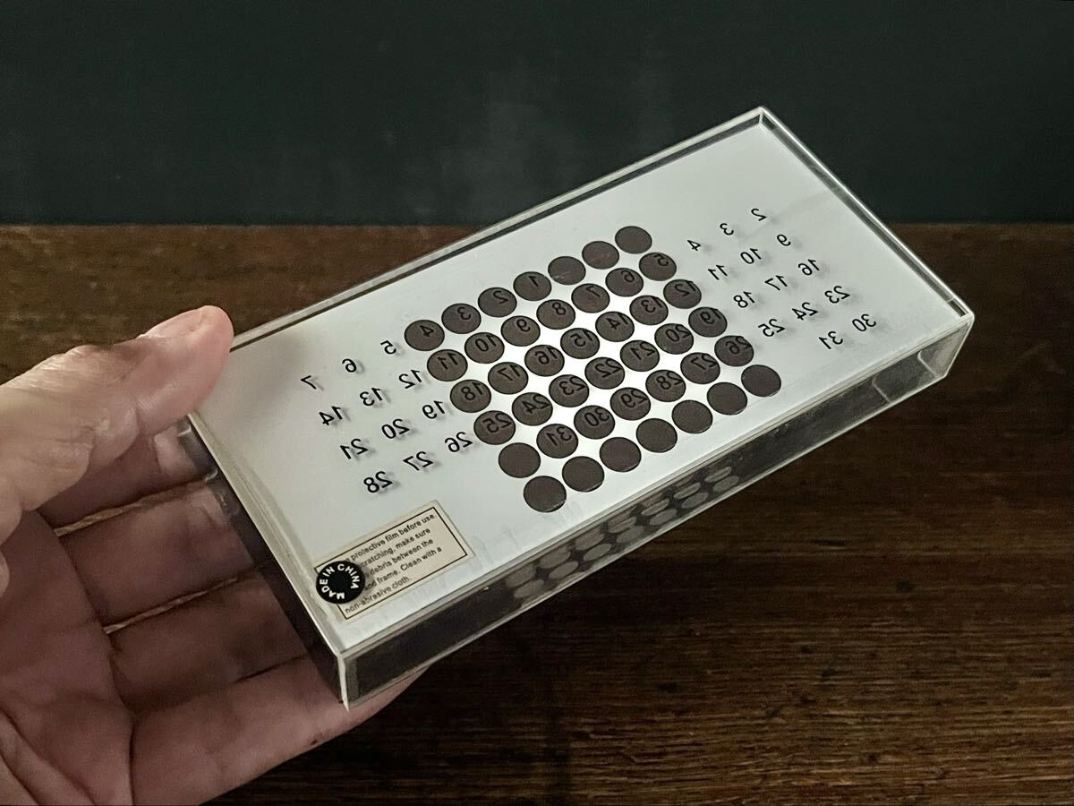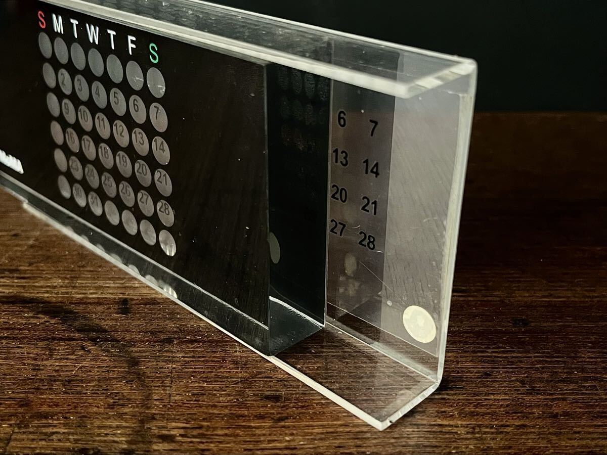 塊のアクリルブロックと別パーツの文字盤をスライドさせるシンプルな卓上カレンダー。万年カレンダーなので、年が変わっても何年先まで繰り返しご利用いただけます。アクリルブロックには後ろの数字が見えるよう丸い窓が付き、裏側(透明)には数字が印刷されたケースがあり、2つのパーツをずらす事によって使用する万年カレンダーです。シンプルでミッドセンチュリーなデザインが格好良いです。
