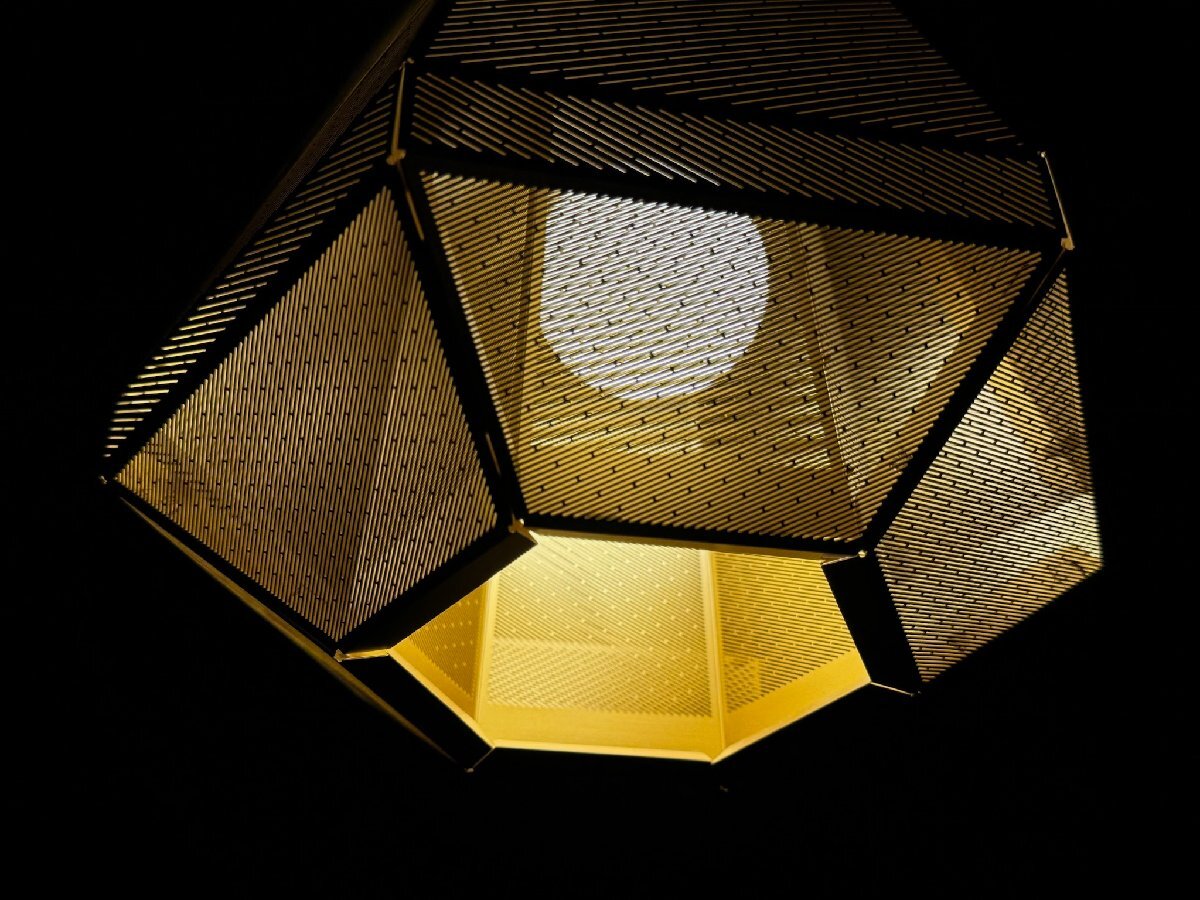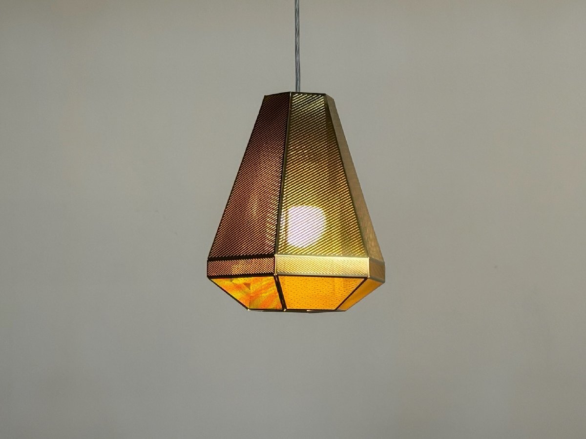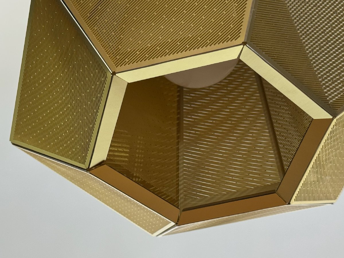 6枚のパンチング仕上げで抜け感を与えられた繊細な真鍮製パネルを丁寧に折り曲げて成形したチャームのようなセードのフォルムは、サイドボードやリビングボードに一点で吊り下げられているだけで気品とクラフツマンシップを高らかに謳い上げる洗練された佇まい。