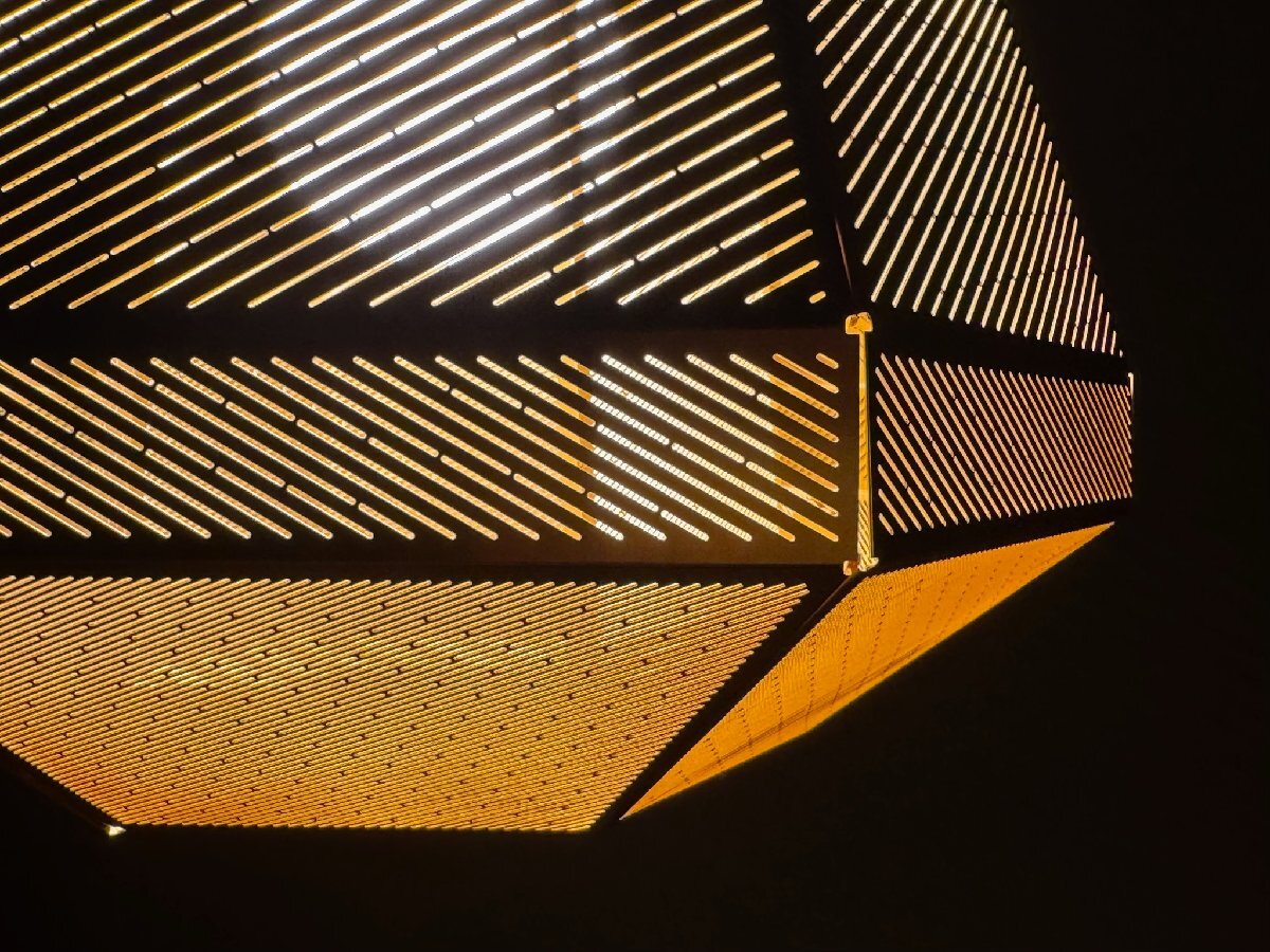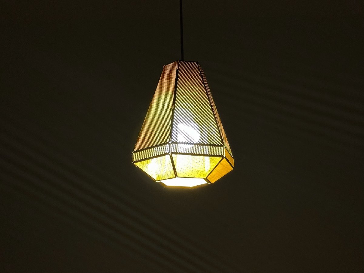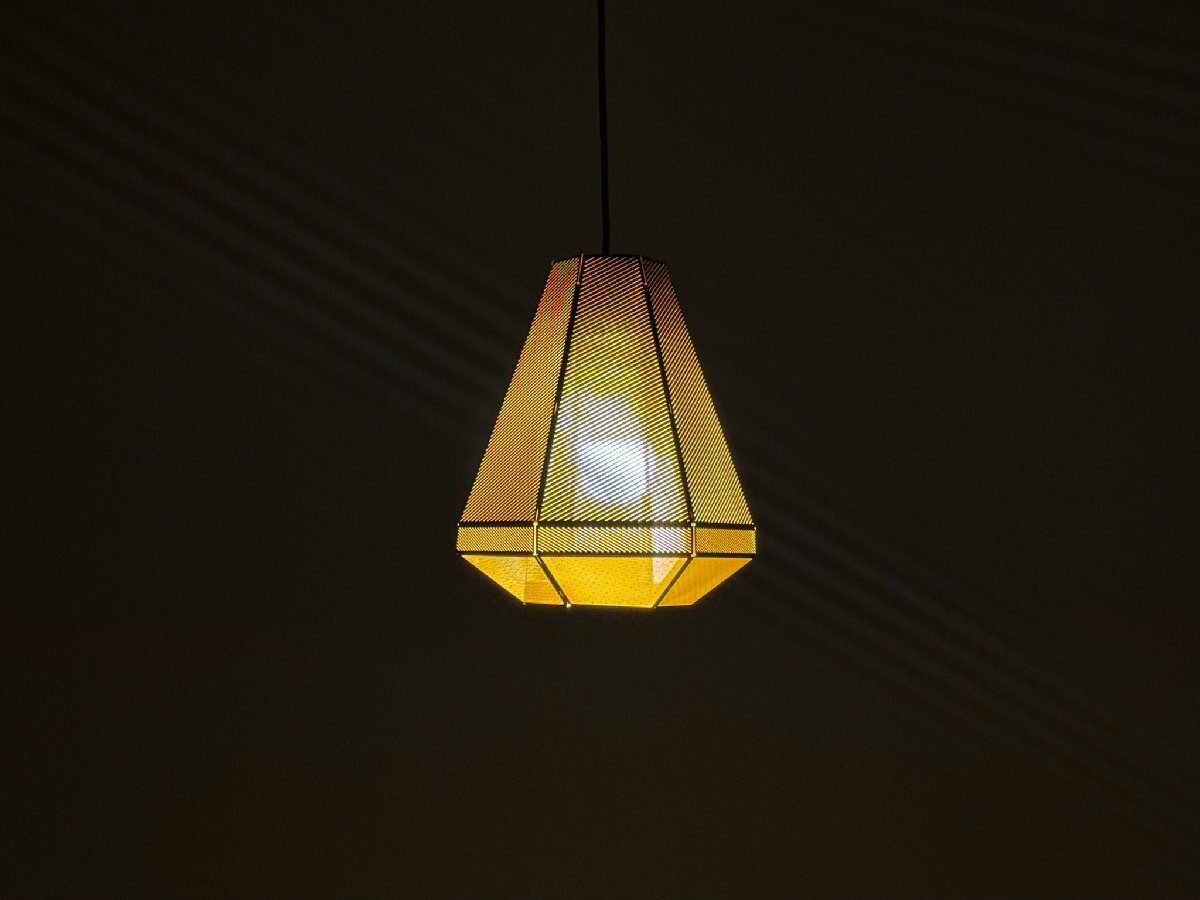 6枚のパンチング仕上げで抜け感を与えられた繊細な真鍮製パネルを丁寧に折り曲げて成形したチャームのようなセードのフォルムは、サイドボードやリビングボードに一点で吊り下げられているだけで気品とクラフツマンシップを高らかに謳い上げる洗練された佇まい。