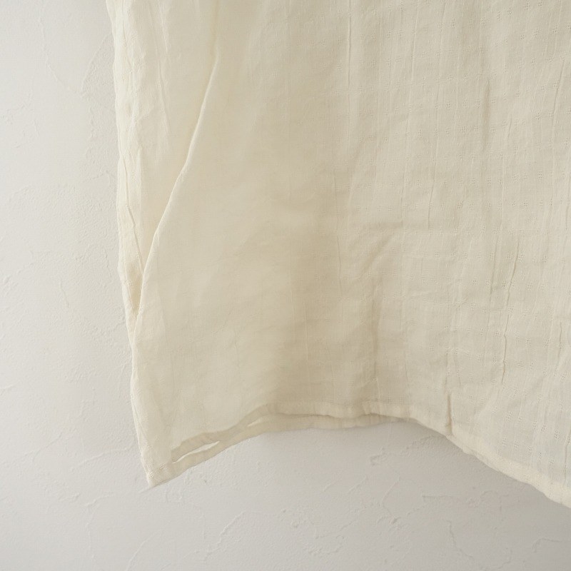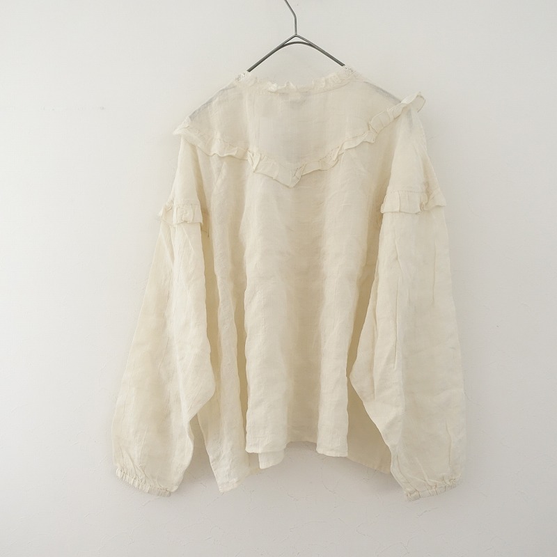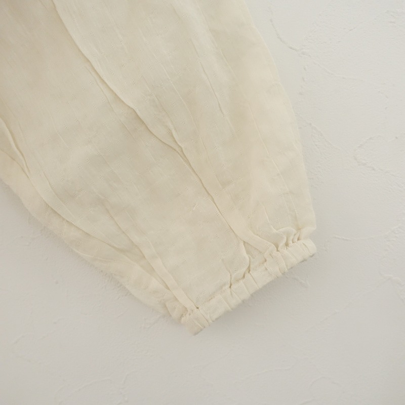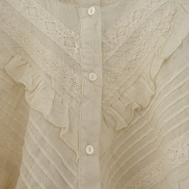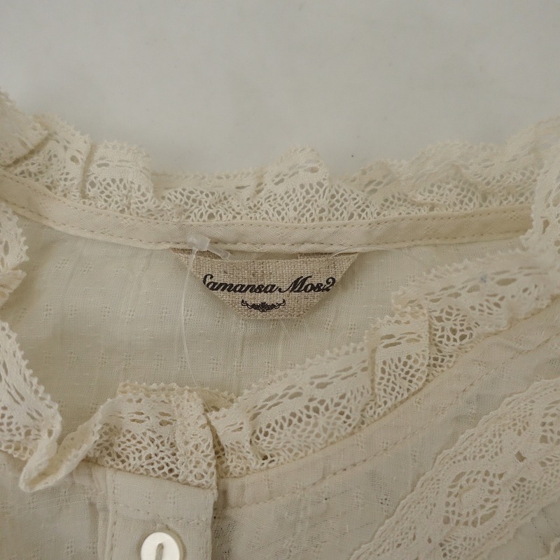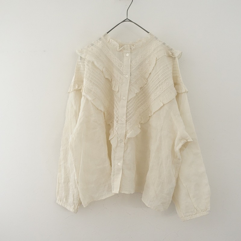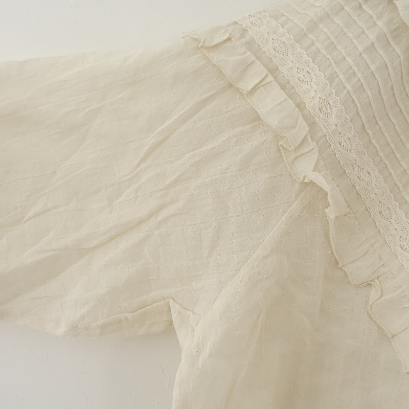 Samansa Mos2 のシャーリングレースピンタックブラウスです。カラー(ブランド表記カラー)はキナリで、透け感ある柔らかな薄手の柄織生地です。レース・ピンタック・共布フリルが施されており、フロントボタンで着脱でき、袖口ゴム入りです。 |
