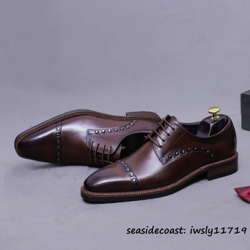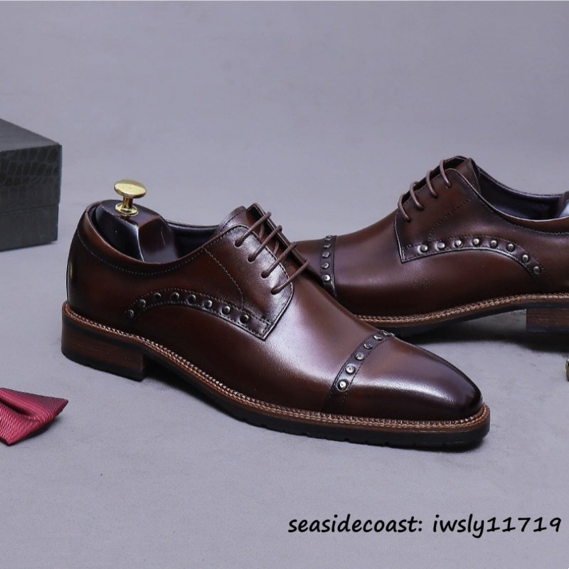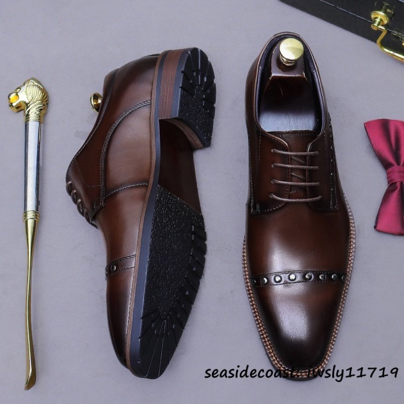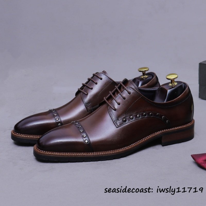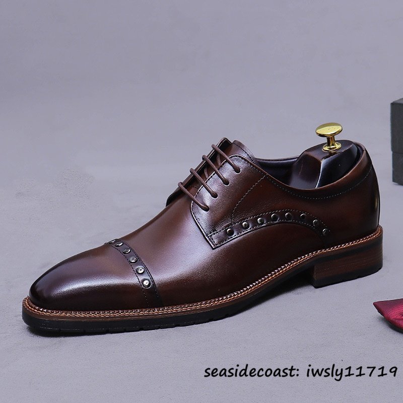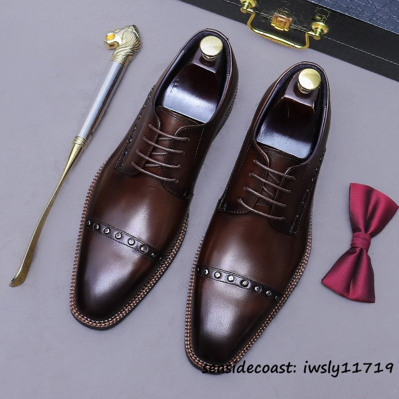 超希少◆ビジネスシューズ メンズ 本革レザーシューズ イギリス風 彫り 職人手作り 高級牛革 紳士靴 革靴 フォーマル 新品 珈琲色 25.5cm