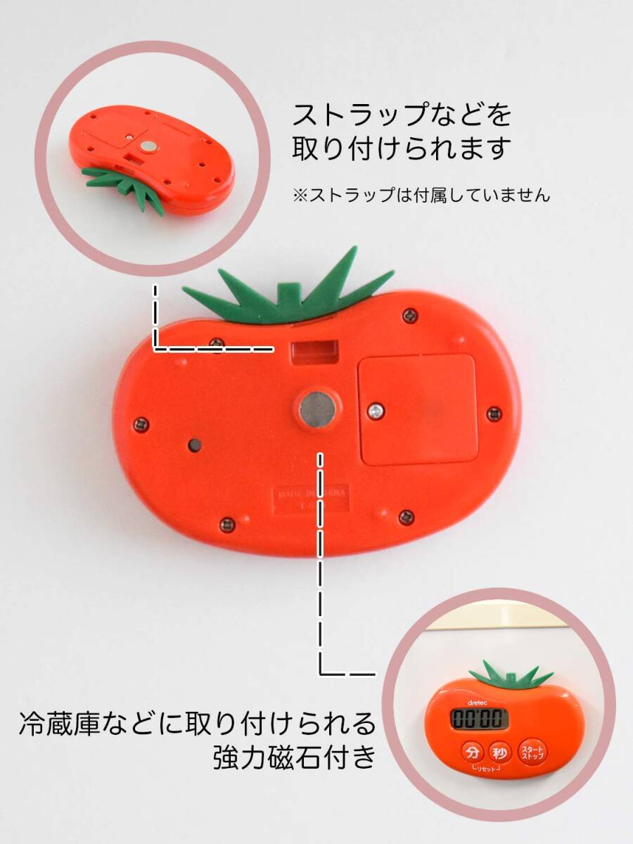 菌の繁殖を抑える抗菌タイプ かわいいとまとをモチーフにしたタイマー 使いやすさ抜群の単機能タイマー (3キータイプ) カウントアップ・ダウン機能・リピート機能 マグネット付き (1個)。ストラップ穴付き