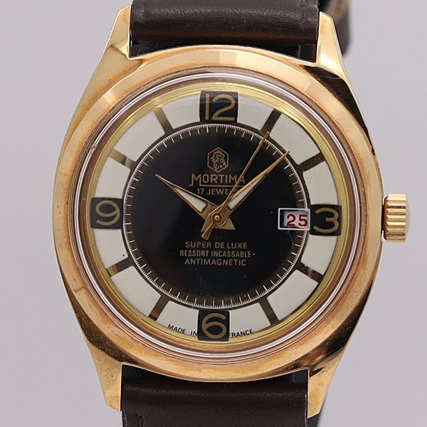 デッドストック級 稼働 良品 モルティマ 手巻き 17石 白×黒文字盤 デイト ラウンド メンズ腕時計 7204ABC TGG4785000SMD