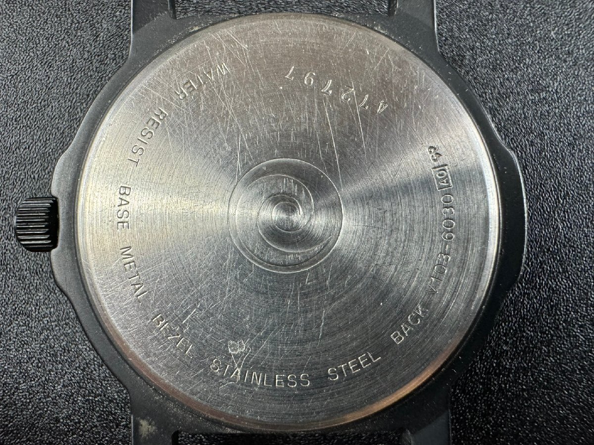 【諸 元】 | 型 番: V103-6030 寸 法:【横】37.5mm(竜頭含まず)×【縦】40.5mm×【厚】9.5mm ※寸法はノギスで測定してますが1mm以下の端数は四捨五入した寸法で記入してます。駆動方式: クォーツ 材 質: ステンレス 製造年月日: 1984年7月製造(推定) |