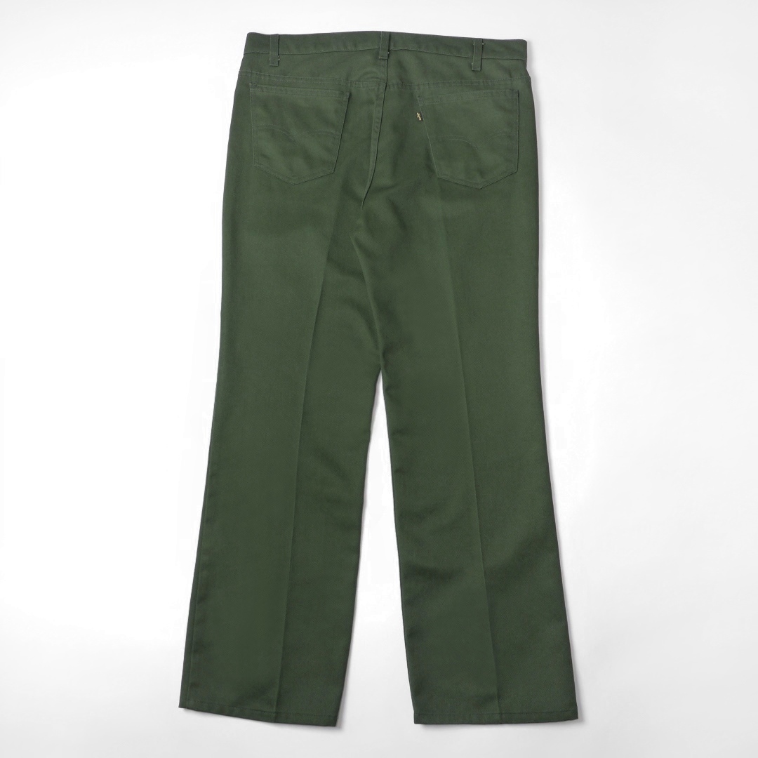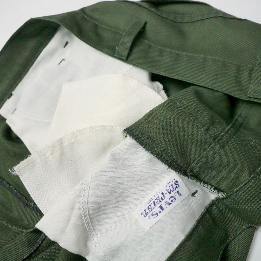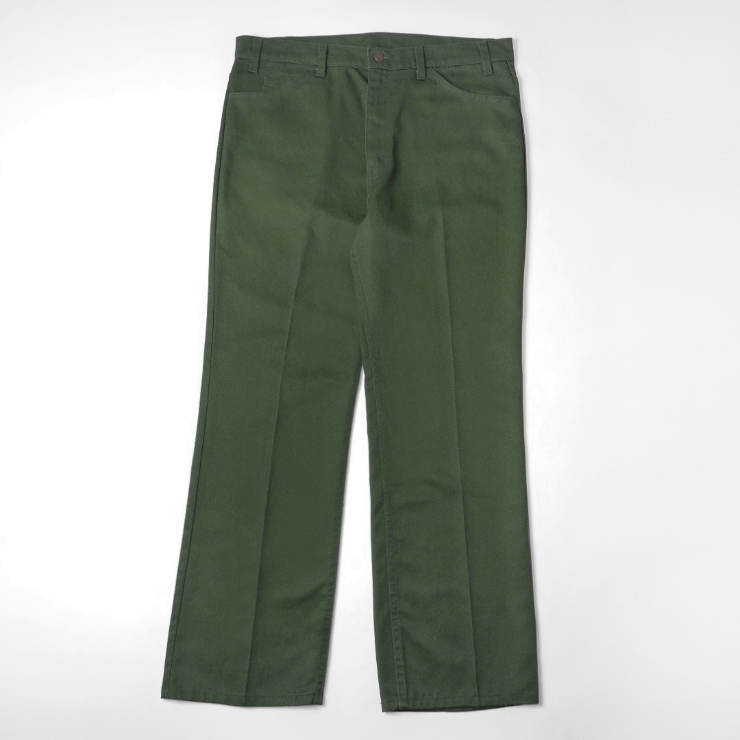 ■ブランド 80s、Levis STA-PREST、517-1838、MADE IN USA ■カラー 深緑色、グリーン/ダークグリーン系 ■素材 50%COTTON 50%FORTREL POLYESTER ■詳細 アメリカで購入したリーバイスの517スタプレ、フレア/ブーツカットパンツです。 80年代(1989年製)、アメリカ製、ボタン裏刻印520、黒タブの金文字でレアなツイルのタイプになります。イイ感じに雰囲気よく経年変化しております。 レアカラーです!! ■状態 コットン特有の多少の色落ち、フェード、アタリ、ほぼ分かりませんがサイドシーム(内側タグ付近)に若干の縫製ミス?リステッチ?あとあり。 特筆すべきダメージなく良好です。生地やスレーキもシッカリとしています。 ■サイズ 表記 W38 L30 (実寸W37 L30 *下記参考下さい) ウェスト 47cm×2 股下 77cm 総丈 106cm 裾幅 23cm 股上前 32cm 股上後 40cm ワタリ 33cm ヒップ 55cm ■注意事項 状態は細かく確認しておりますが、傷や汚れの見落とし、実寸誤差、色味差異など生じる場合がございます。 不明な点がありましたら入札前にご質問下さい。 商品にあわせて洗濯やクリーニングメンテナンスを施しておりますが、ビンテージやアンティークなど中古品になりますので特性のご理解をお願いします。 |