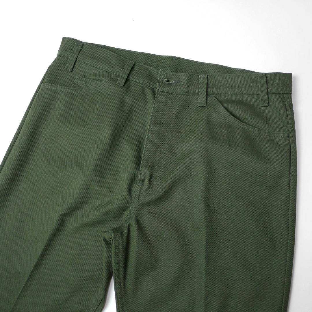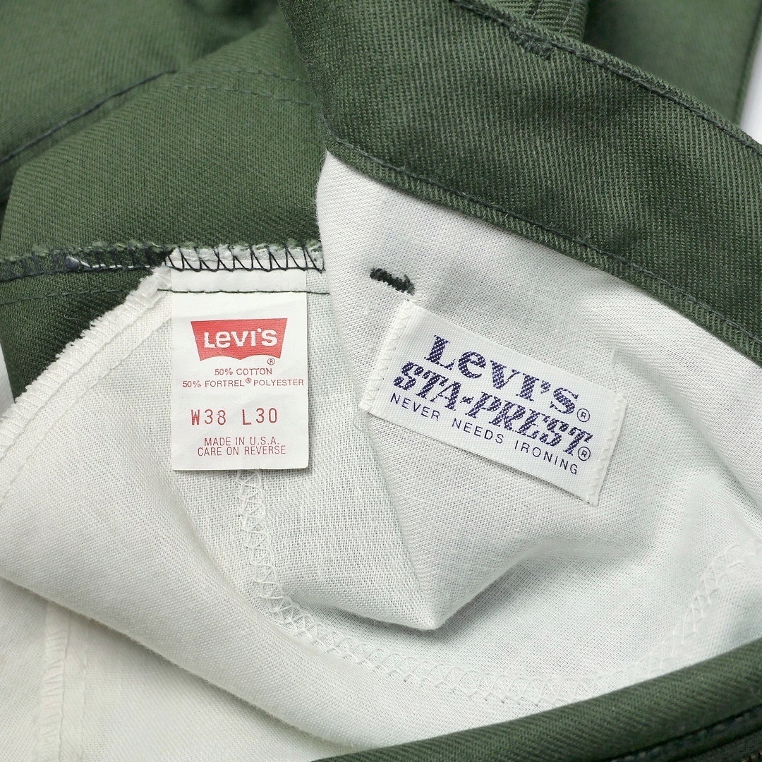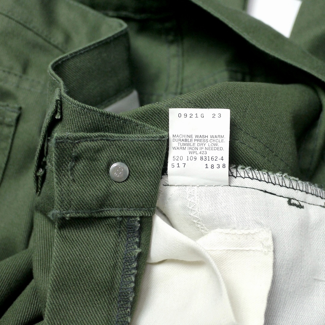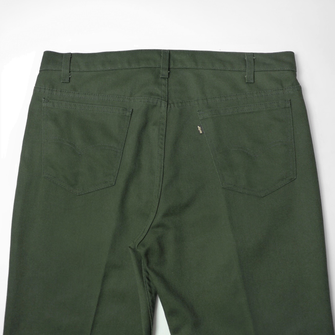 ■ブランド 80s、Levis STA-PREST、517-1838、MADE IN USA ■カラー 深緑色、グリーン/ダークグリーン系 ■素材 50%COTTON 50%FORTREL POLYESTER ■詳細 アメリカで購入したリーバイスの517スタプレ、フレア/ブーツカットパンツです。 80年代(1989年製)、アメリカ製、ボタン裏刻印520、黒タブの金文字でレアなツイルのタイプになります。イイ感じに雰囲気よく経年変化しております。 レアカラーです!! ■状態 コットン特有の多少の色落ち、フェード、アタリ、ほぼ分かりませんがサイドシーム(内側タグ付近)に若干の縫製ミス?リステッチ?あとあり。 特筆すべきダメージなく良好です。生地やスレーキもシッカリとしています。 ■サイズ 表記 W38 L30 (実寸W37 L30 *下記参考下さい) ウェスト 47cm×2 股下 77cm 総丈 106cm 裾幅 23cm 股上前 32cm 股上後 40cm ワタリ 33cm ヒップ 55cm ■注意事項 状態は細かく確認しておりますが、傷や汚れの見落とし、実寸誤差、色味差異など生じる場合がございます。 不明な点がありましたら入札前にご質問下さい。 商品にあわせて洗濯やクリーニングメンテナンスを施しておりますが、ビンテージやアンティークなど中古品になりますので特性のご理解をお願いします。 |