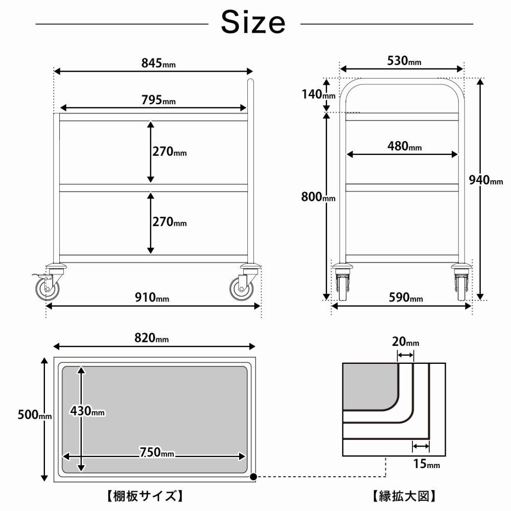 仕様 | 3段 片側ハンドル、キャスター4輪自在、2輪ストッパー付 |
