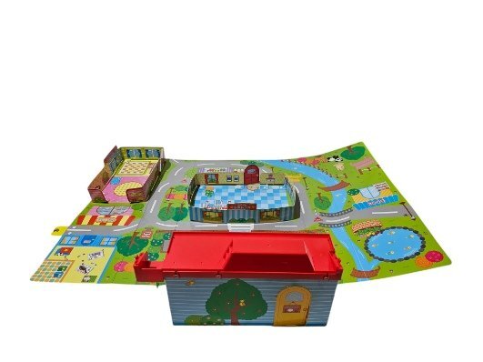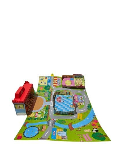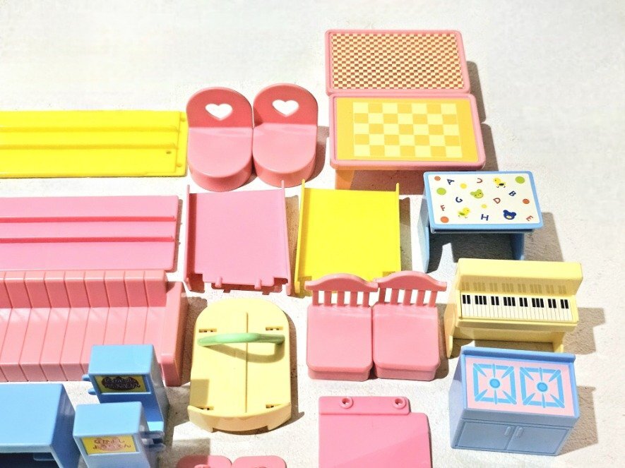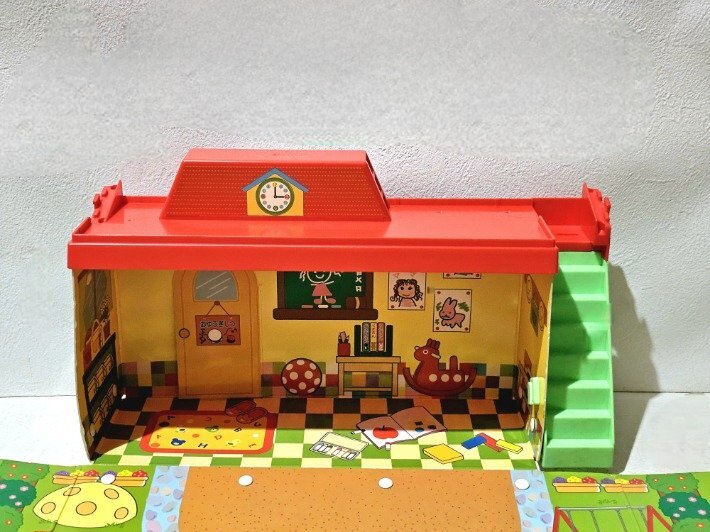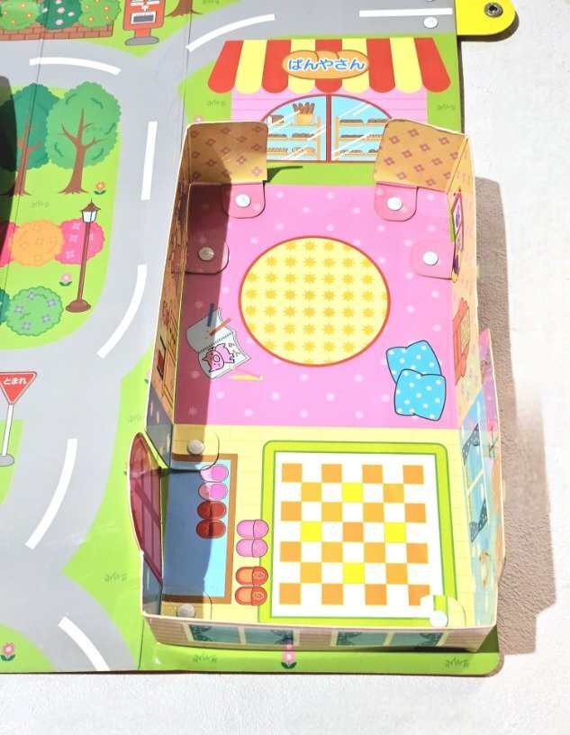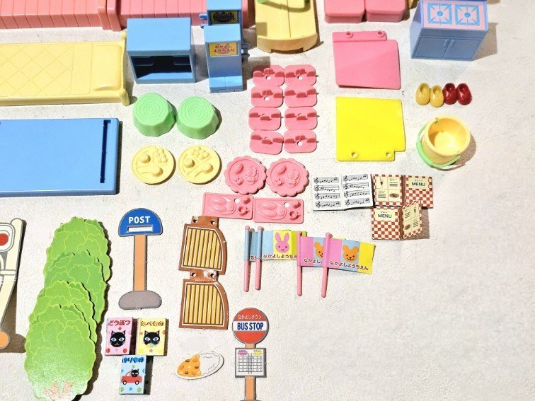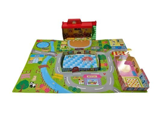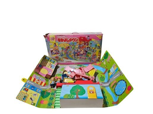 商品説明 ミキちゃんマキちゃん なかよしタウンの一式セットです。 外箱に人形は入っていないと記載がありますが、フィギュアは2体含まれています。 詳細 ●サイズ:奥行69cm、幅89.5cm、高さ20cm ●ランク:ヴィンテージランク ●コンディション:内部や側面に傷、汚れがあります。 紙製のハンバーグ・ホットケーキ・手紙2点が欠品しています。 |
