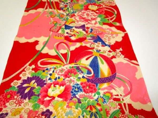 F-34★赤ピンク*貝桶*貝*手扇*鼓*手毬*御所車*牡丹*菊*綸子*古布はぎれ★吊るし雛/市松人形/一閑張り/文化人形