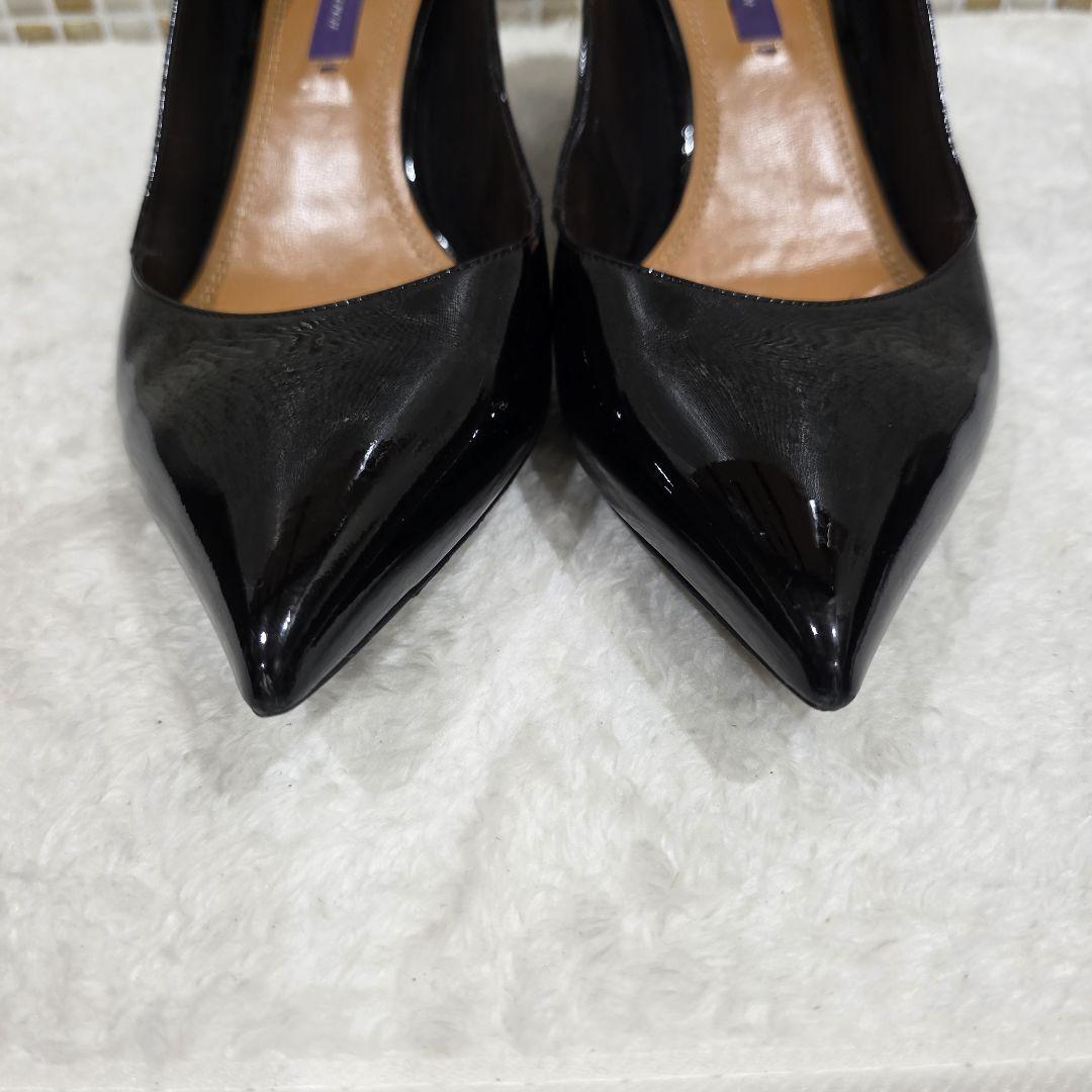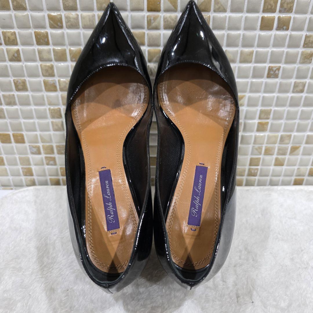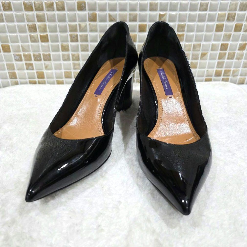 艶やかなエナメル素材を使用したRalph Laurenのパンプス。シャープなポインテッドトゥと、安定感のある太ヒールが特徴で、女性らしさと履きやすさを両立した一足です。通勤やフォーマルシーンにも活躍します。履き口に若干のほつれがありますが、全体的には光沢も残り綺麗な印象です。