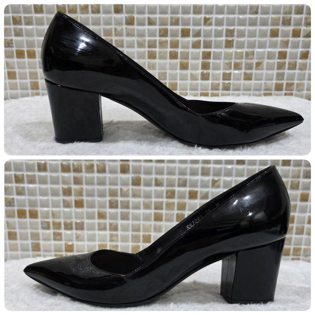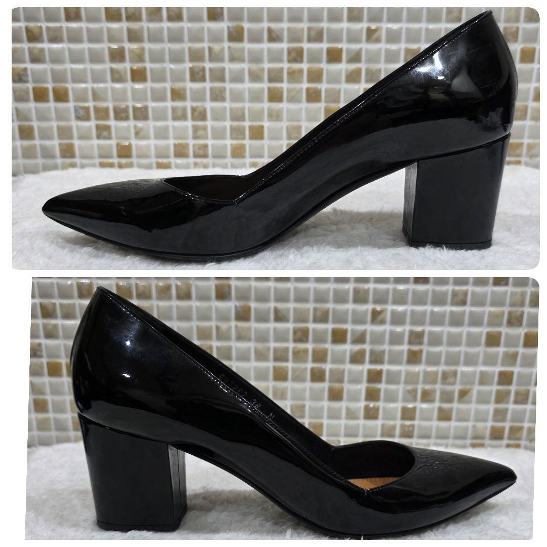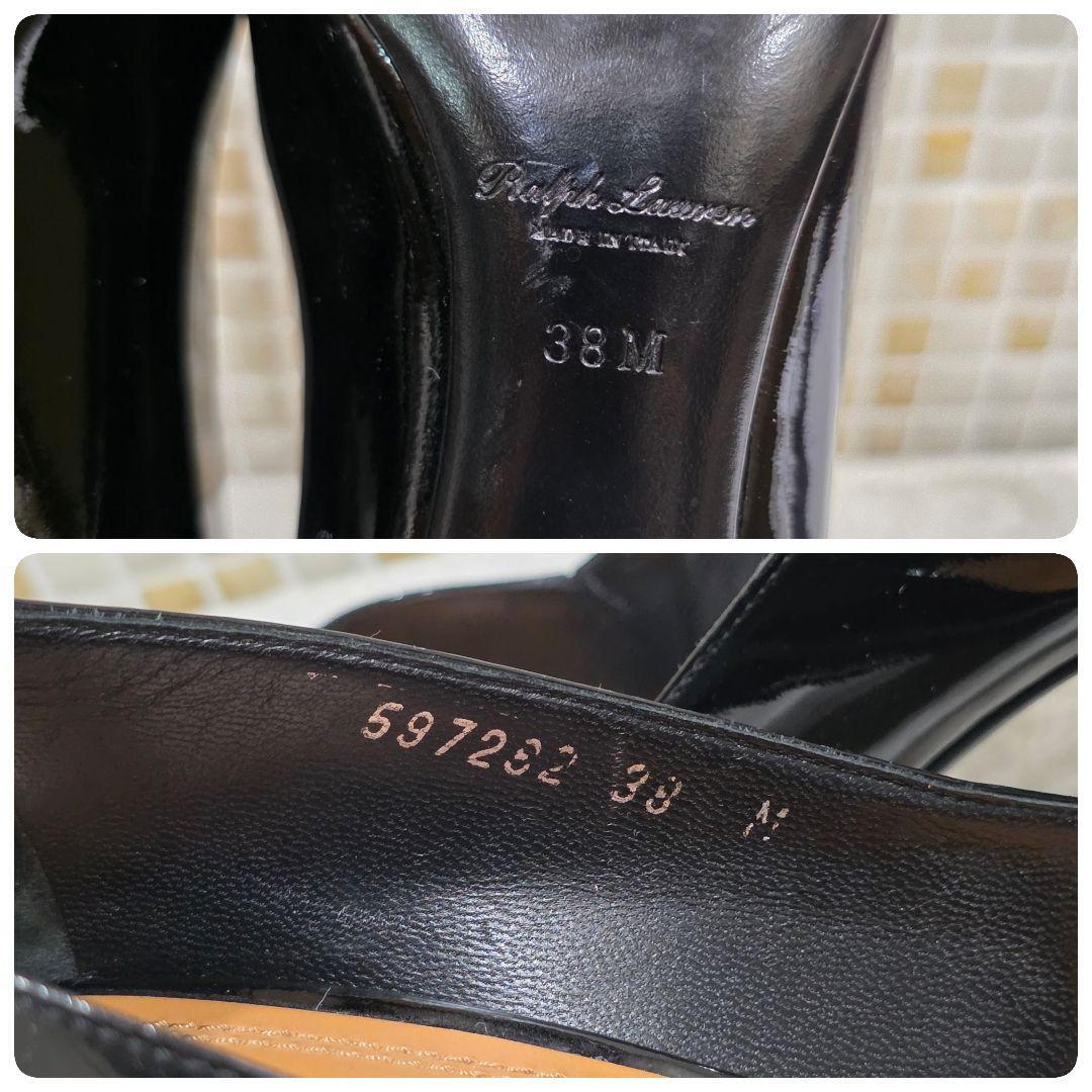 艶やかなエナメル素材を使用したRalph Laurenのパンプス。シャープなポインテッドトゥと、安定感のある太ヒールが特徴で、女性らしさと履きやすさを両立した一足です。通勤やフォーマルシーンにも活躍します。履き口に若干のほつれがありますが、全体的には光沢も残り綺麗な印象です。