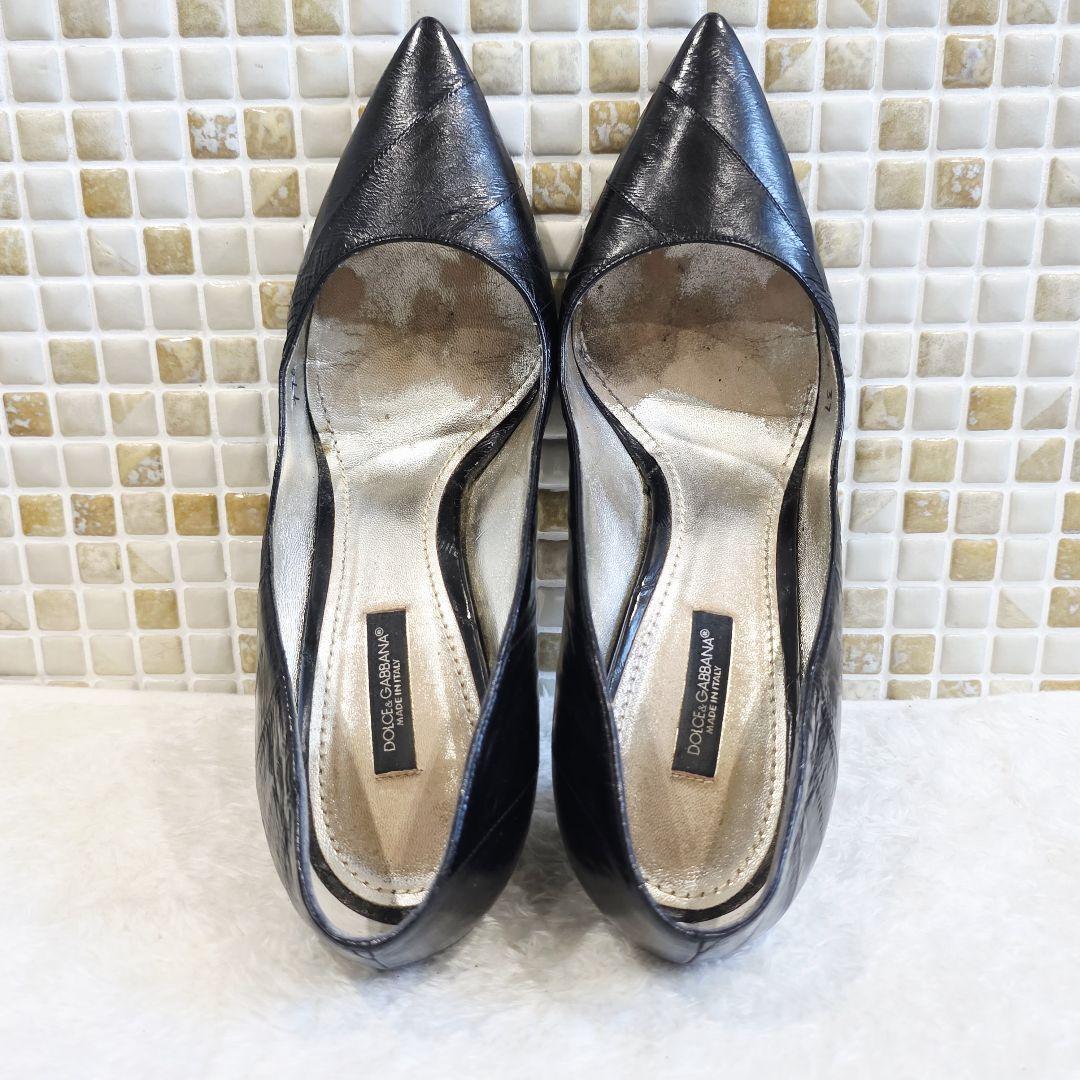 艶のあるブラックレザーに、シャープなポインテッドトゥが映えるD&Gのエレガントなパンプス。上品な光沢と美しいシルエットで、足元をすっきり見せてくれます。