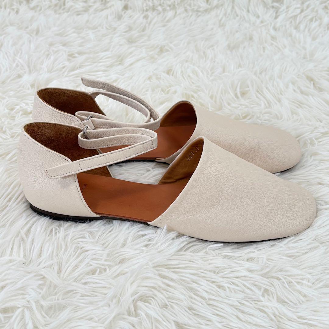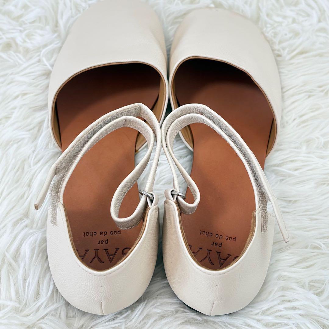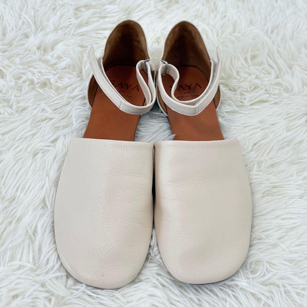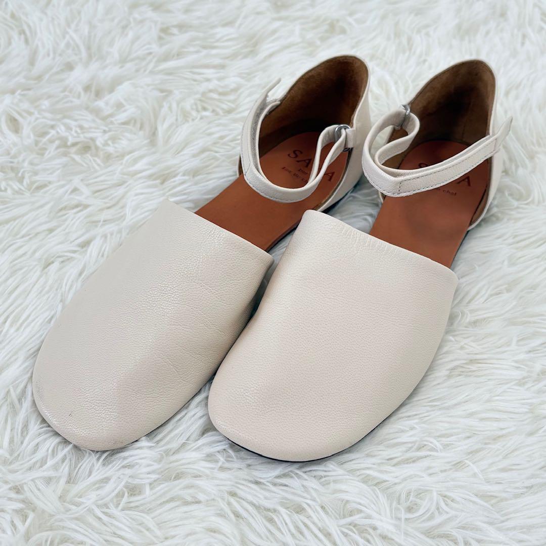 美品 SAYA サヤ ストラップフラットシューズ パンプス 24cm 革 日本製 ベージュ系 白系