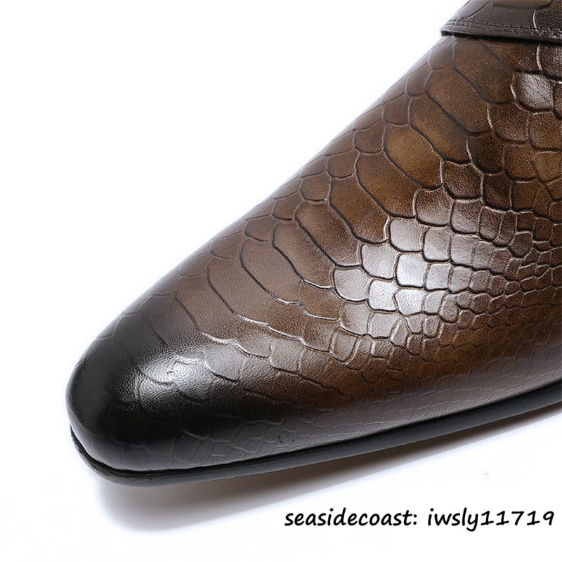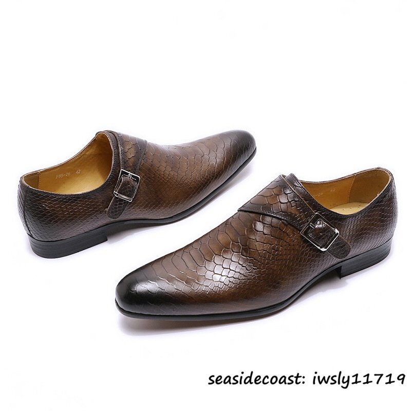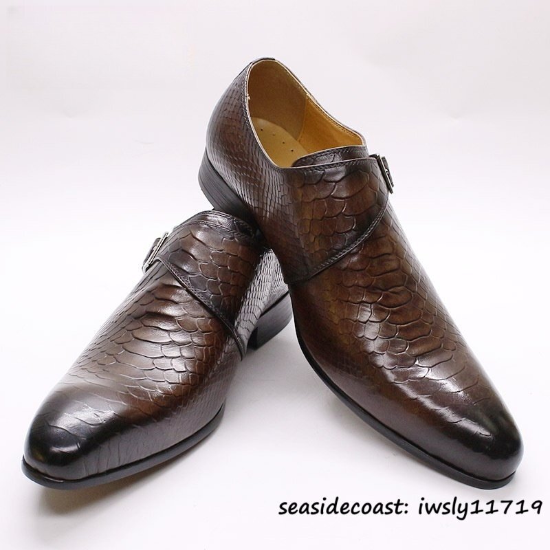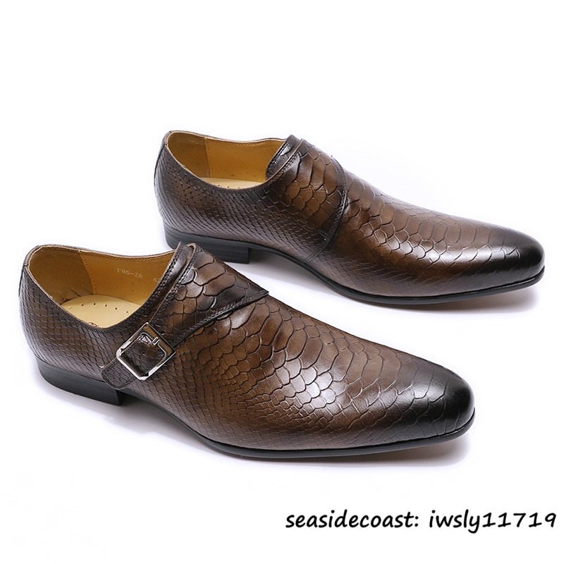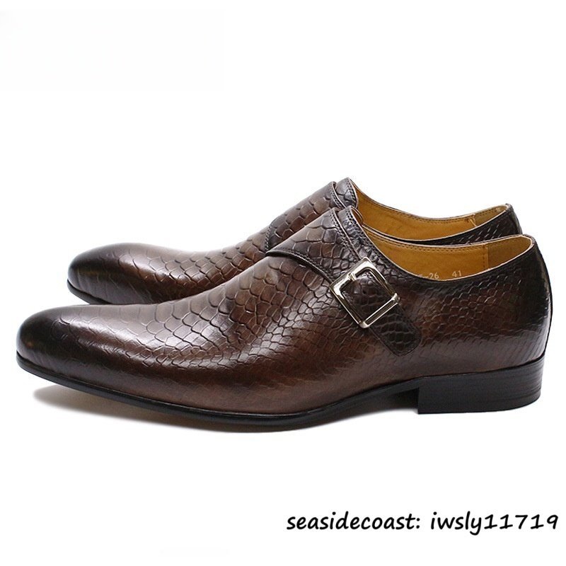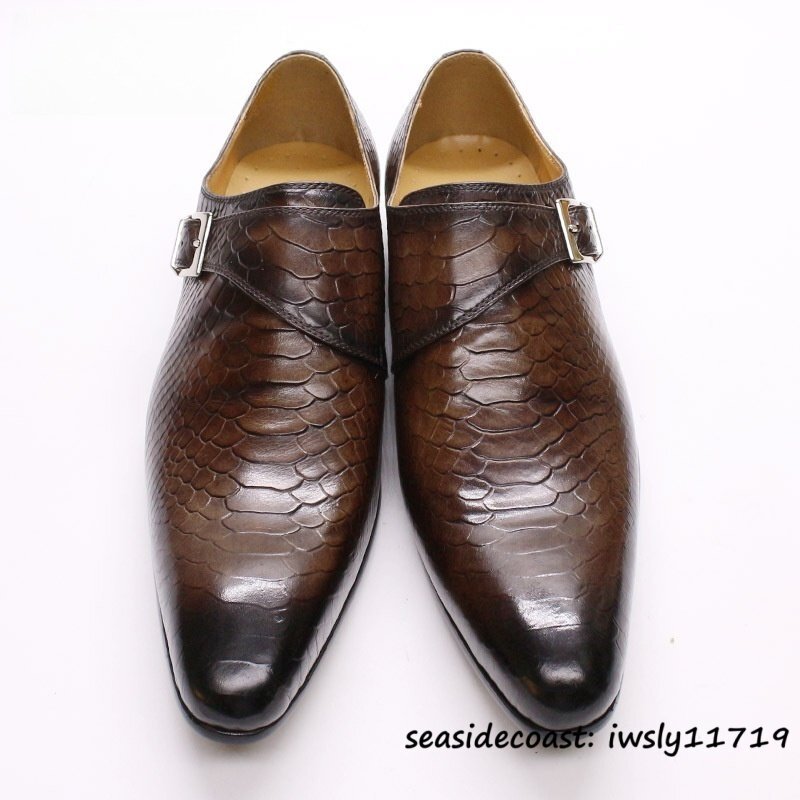 定価9万超★ビジネスシューズ 本革 レザーシューズ 職人手作り モンクストラップ 紳士靴 鰐柄 牛革 ドレス 結婚式 革靴 珈琲色 25.0cm