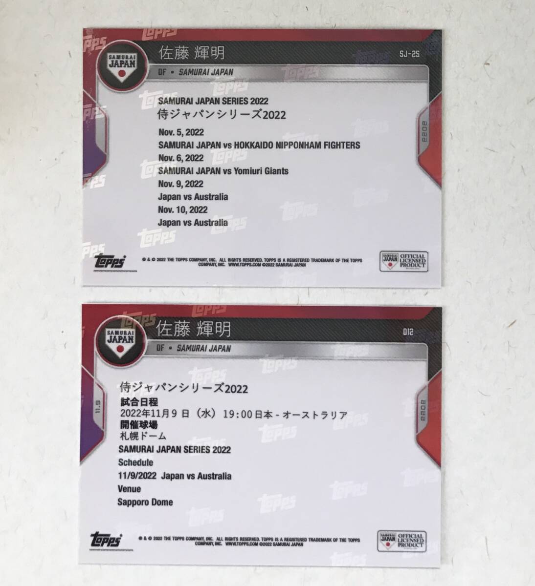 2枚セット(topps now) 佐藤輝明 阪神タイガース SAMURAI JAPAN 2022