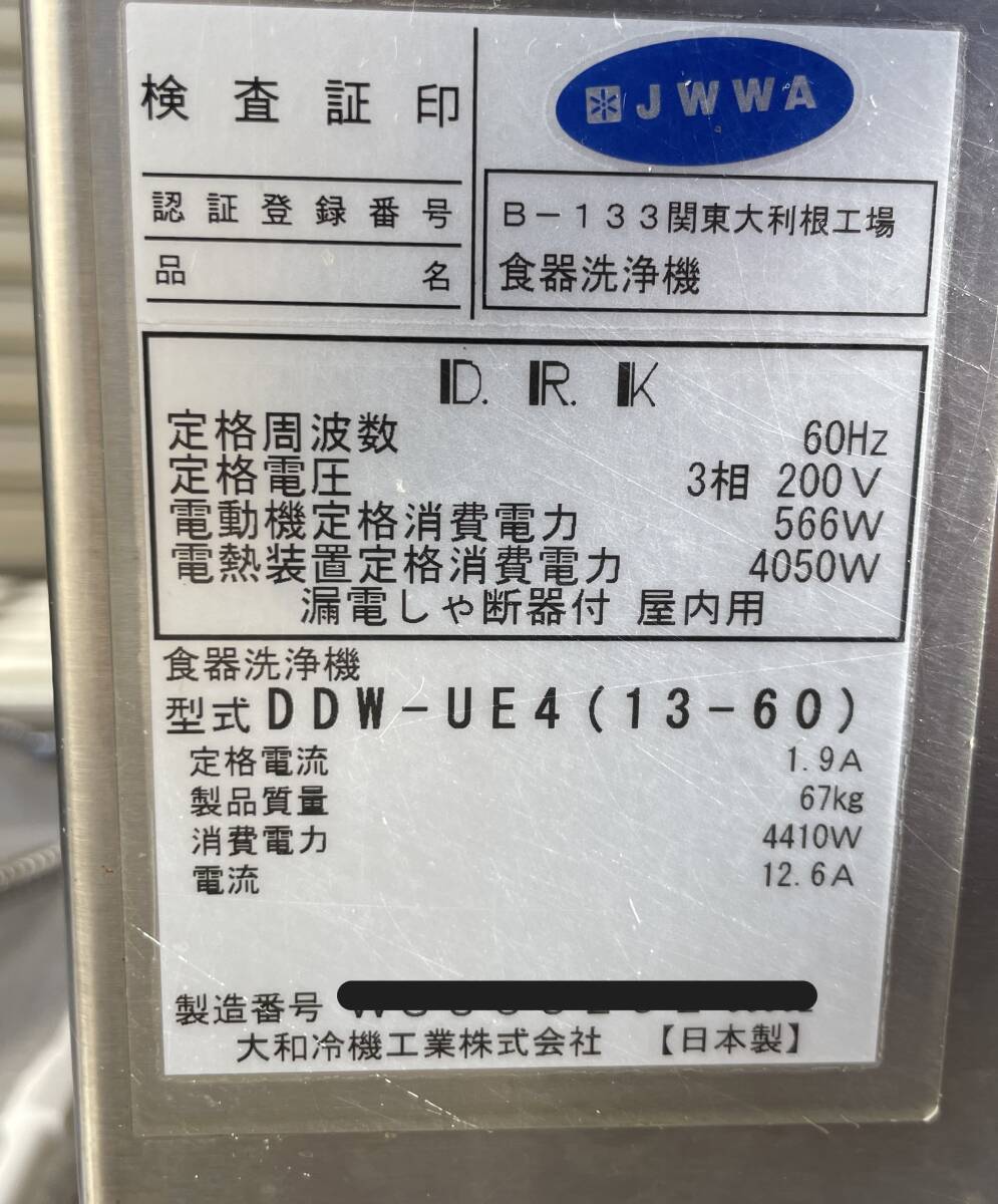 | 大和冷機工業株式会社 食器洗浄機/DDW-UE4(13-60) 2022年製 |