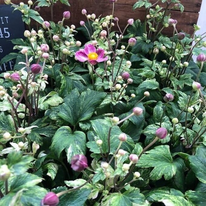 美しいピンクと白の絞り咲き花が見応えのあるシュウメイギクで、かすり状の斑入り葉も魅力。