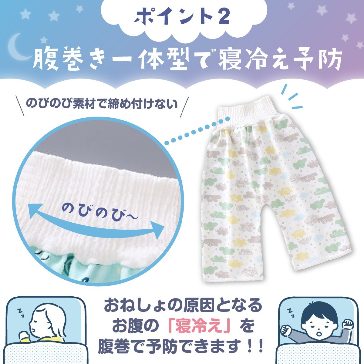 腹巻付きのため、お布団を蹴飛ばしても、お腹を冷やすことなく冷え対策にもおすすめです!