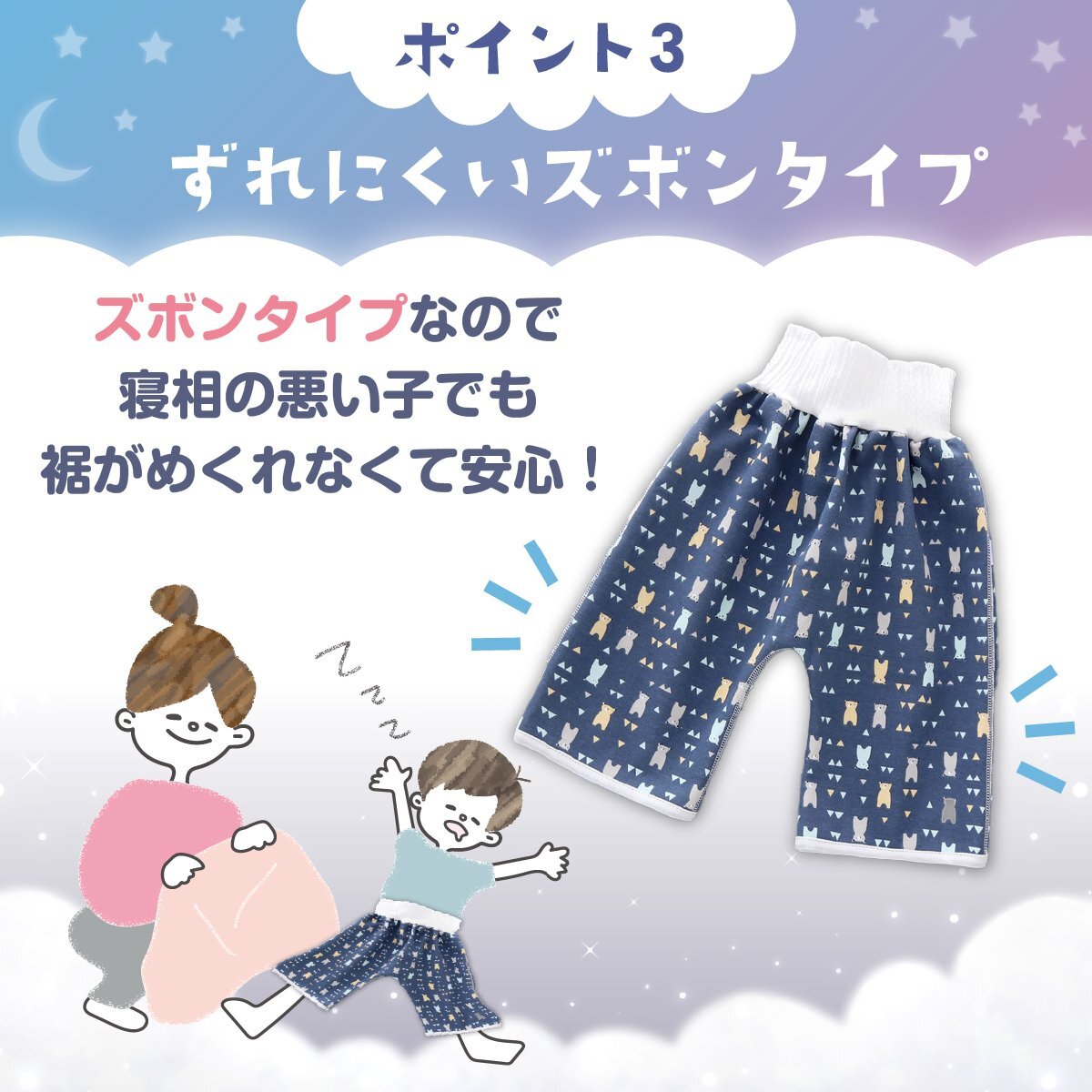 おねしょ対策ズボンは防水仕様のため、敷布団・シーツ・掛布団が濡れてしまうのを防いでくれます。