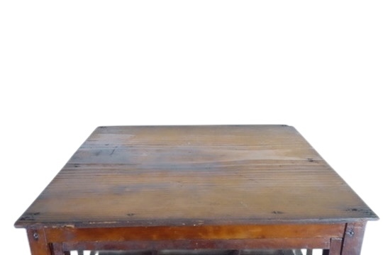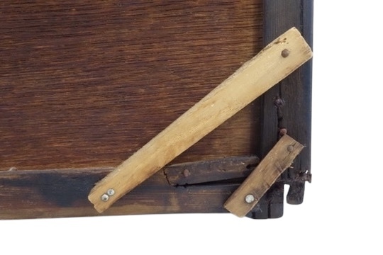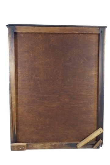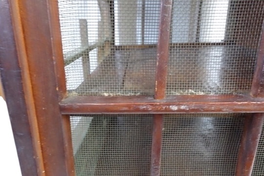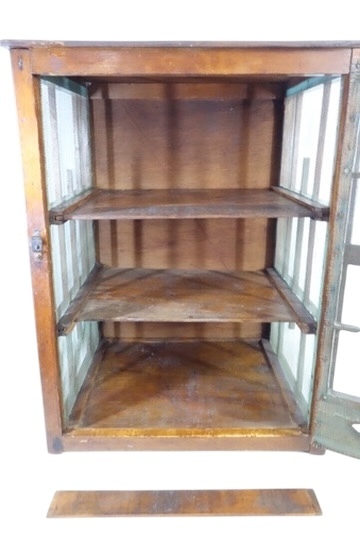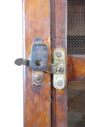 状態: 古いものなので、木材の経年による変色や小傷、網戸のへこみなどがあります。アンティーク品ならではの風合いとしてお楽しみください。扉の開閉はスムーズに行えます。二段目の板の部分が外れている状態です。