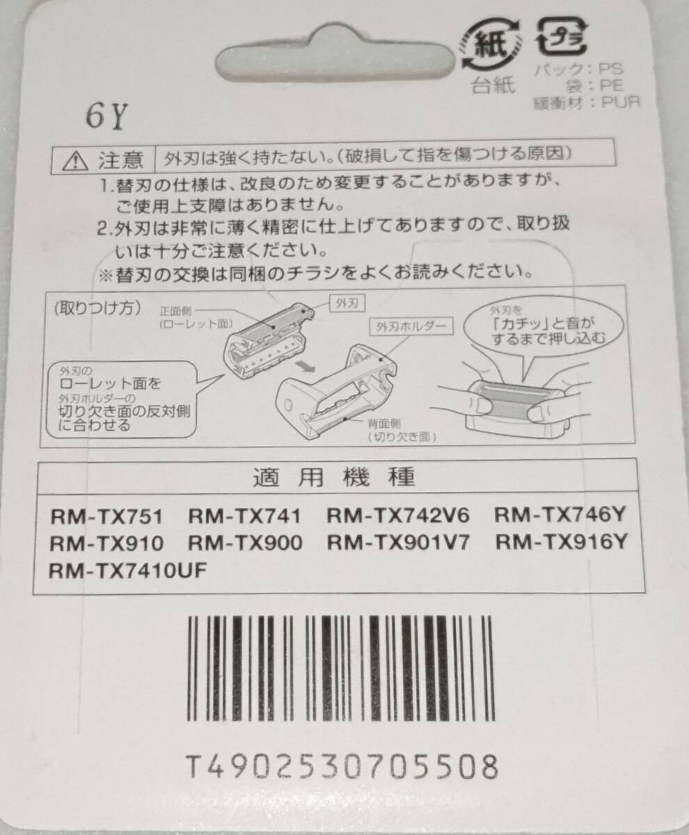 | 商品説明 | 未使用ですがパッケージ一部不良です 交換目安約1年 替刃の種類 外刃 適用機種:RM-TX741、RM-TX751、RM-TX900、RM-TX910、RM-TX742V6、RM-TX746Y、RM-TX901V7、RM-TX916Y |