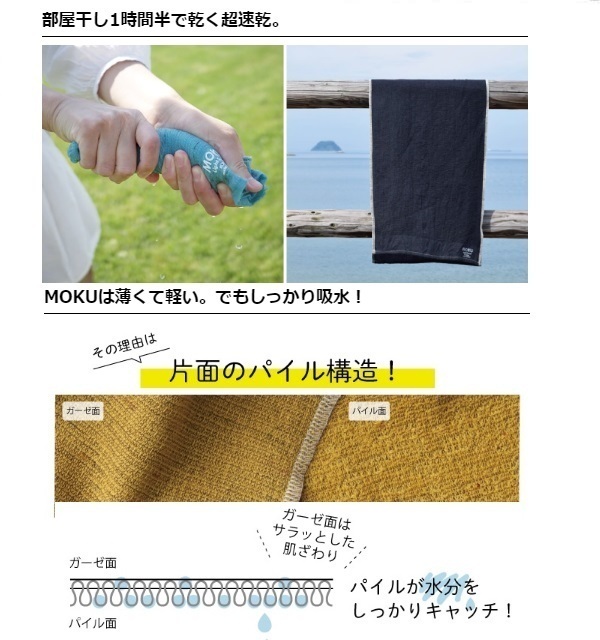 吸水・速乾に優れ、スポーツやアウトドア、温泉、サウナなど幅広いシーンで活躍します。