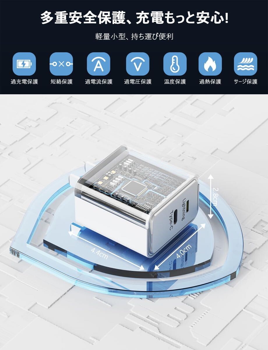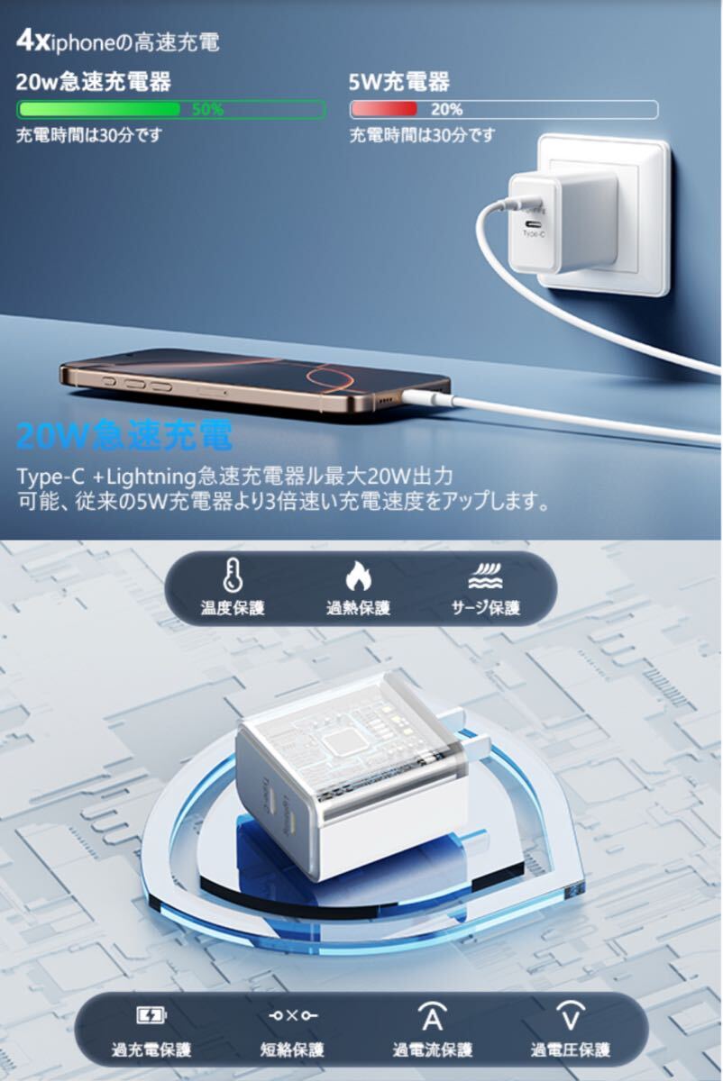 【Type-C+Lightning 一体型急速充電】:PSE認証済み双方向可逆充電技術 Type-C+Lightning 一体型充電器セットなので、Power Delivery規格に対応しており、最大3A/ 20Wの高速充電に対応し普通のケーブルより早いスピードで充電が可能で、 効率的に充電時間を節約します。Apple MFi認証を受けた2mのiphone 充電ケーブルが付属しており、iOSがアップグレードされても全く問題ありません。あらゆる充電ニーズに対応しています。最大3A急速充電、採用された高品質な銅線は電気抵抗が低く、iPhone 16 Pro Maxであれば、たった30分間の充電で60%までチャージすることができます。